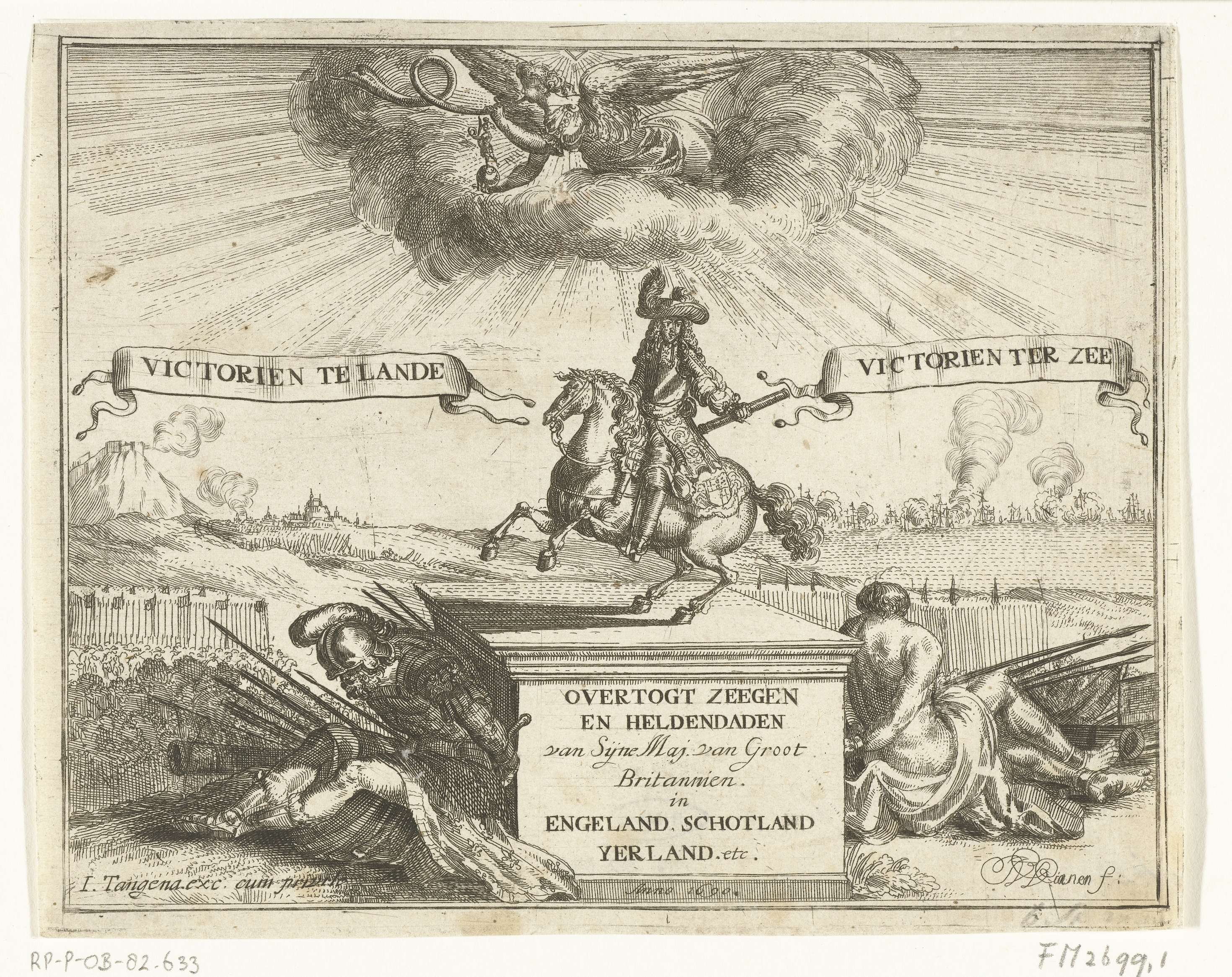 Ruiterstandbeeld van koning Willem III op voetstuk, op de grond de overwonnen en geketende vijanden, in de lucht de Faam. Titelprent van een serie van overwinningen van koning Willem III in 1690.