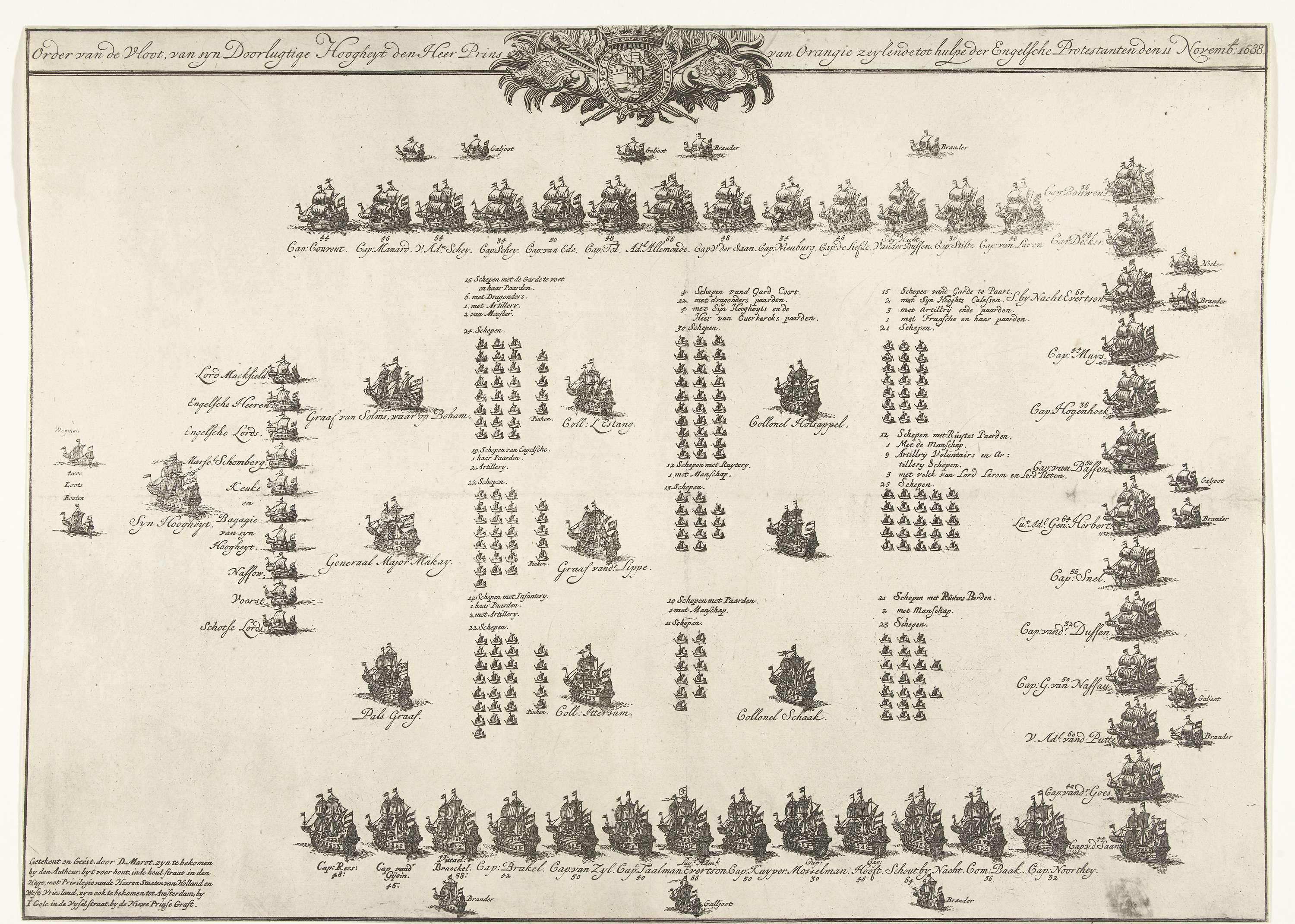 De formatie van de vloot waarmee prins Willem III vanuit Hellevoetsluis naar Engeland is vertrokken, 11 november 1688. In de plaat de aantallen schepen en de namen van de kapiteins. Op de achterzijde van het blad bevinden zich enkele potloodschetsen van ornamenten.