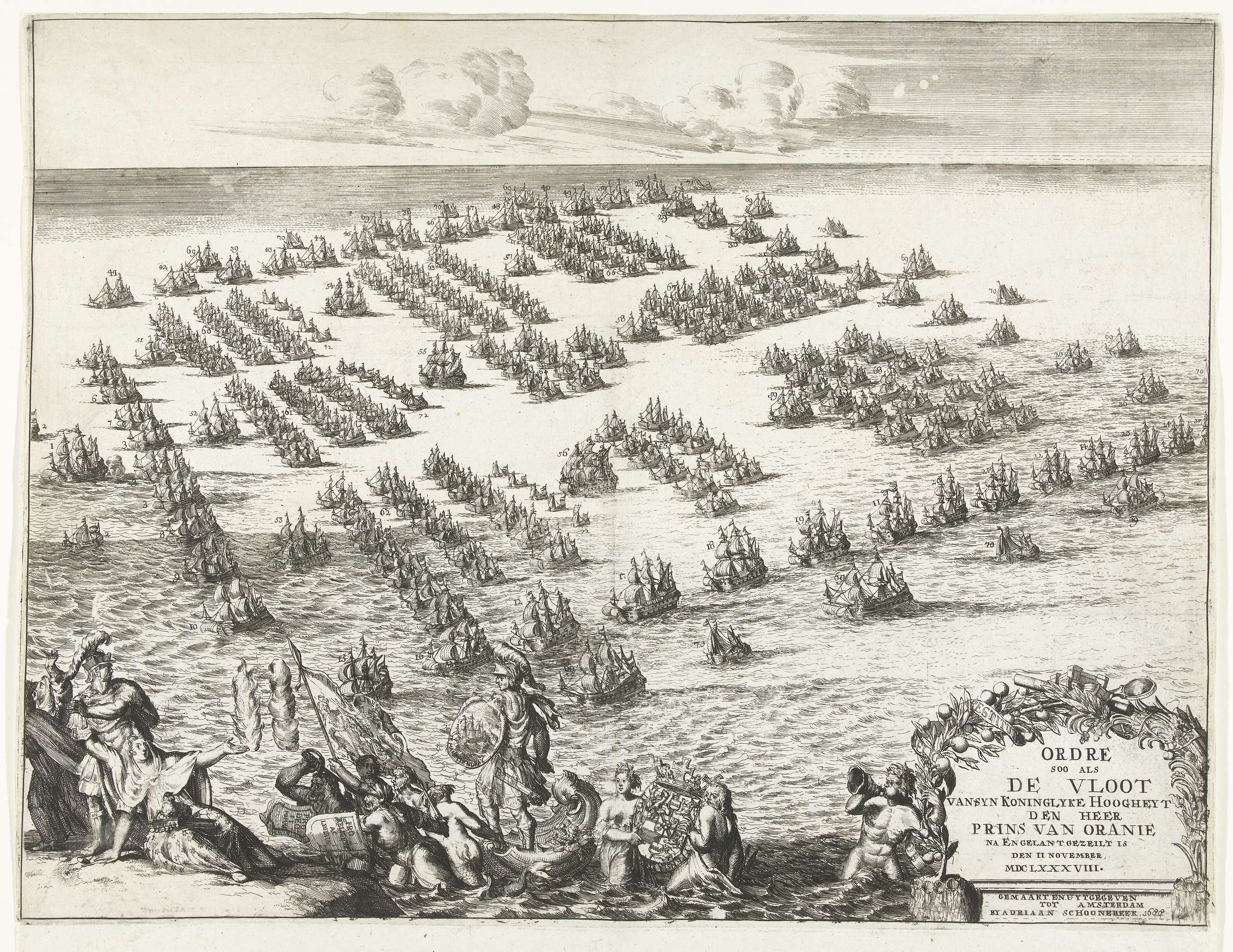De formatie van de vloot waarmee prins Willem III vanuit Hellevoetsluis naar Engeland is vertrokken, 11 november 1688. Gezicht op de formatie in vogelvluchtperspectief. Op de voorgrond links een allegorische voorstelling van de komst van Willem III over zee ter redding van Religie en verjaging van Oorlog en het Katholieke Geloof. Rechtsonder een cartouche met ...