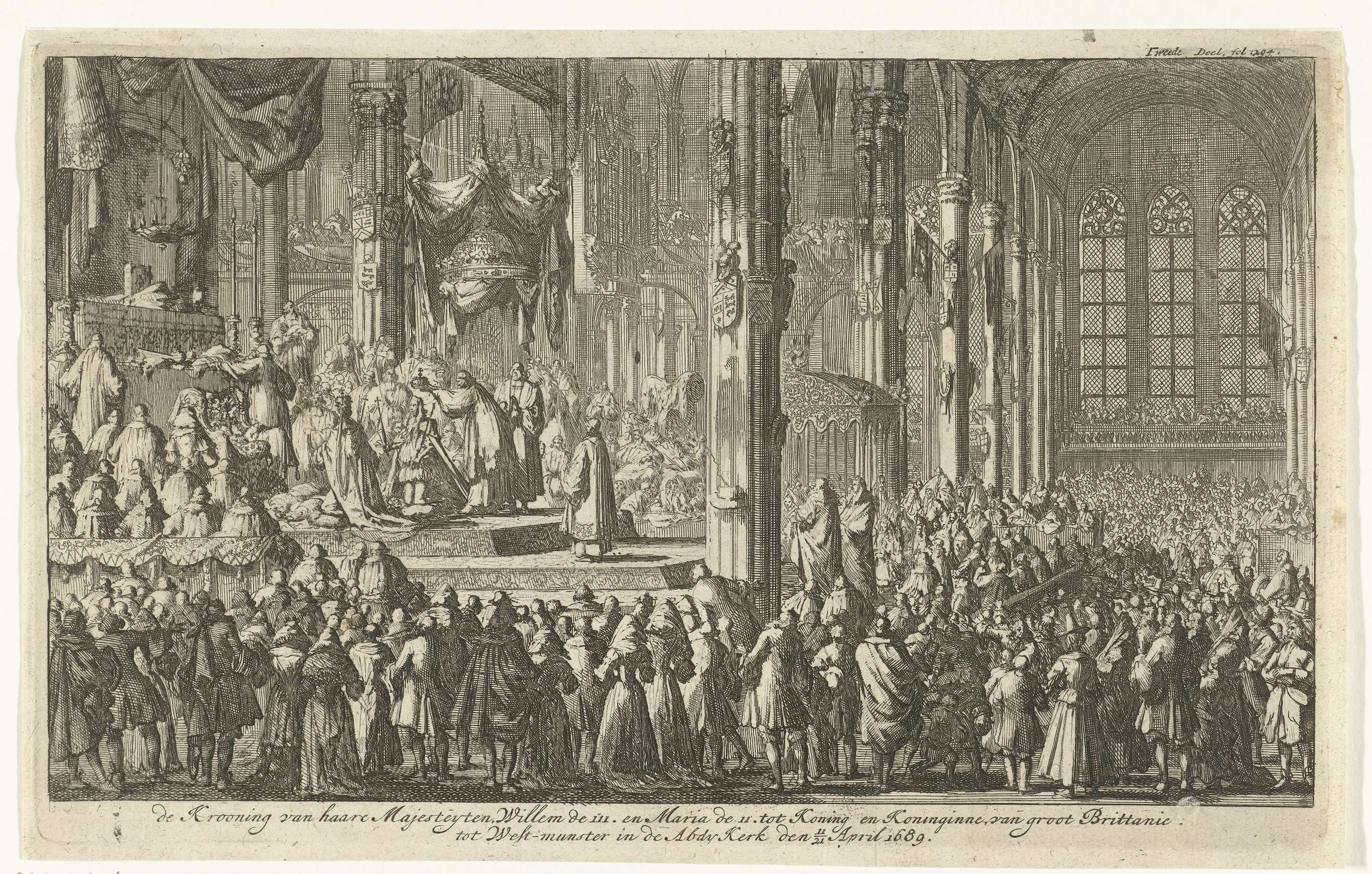 Kroning van prins Willem III en prinses Maria II Stuart tot koning en koningin van Engeland in de Westminster Abbey, 21 april 1689. Gemerkt rechtsboven: Tweede Deel, fol: 294.
