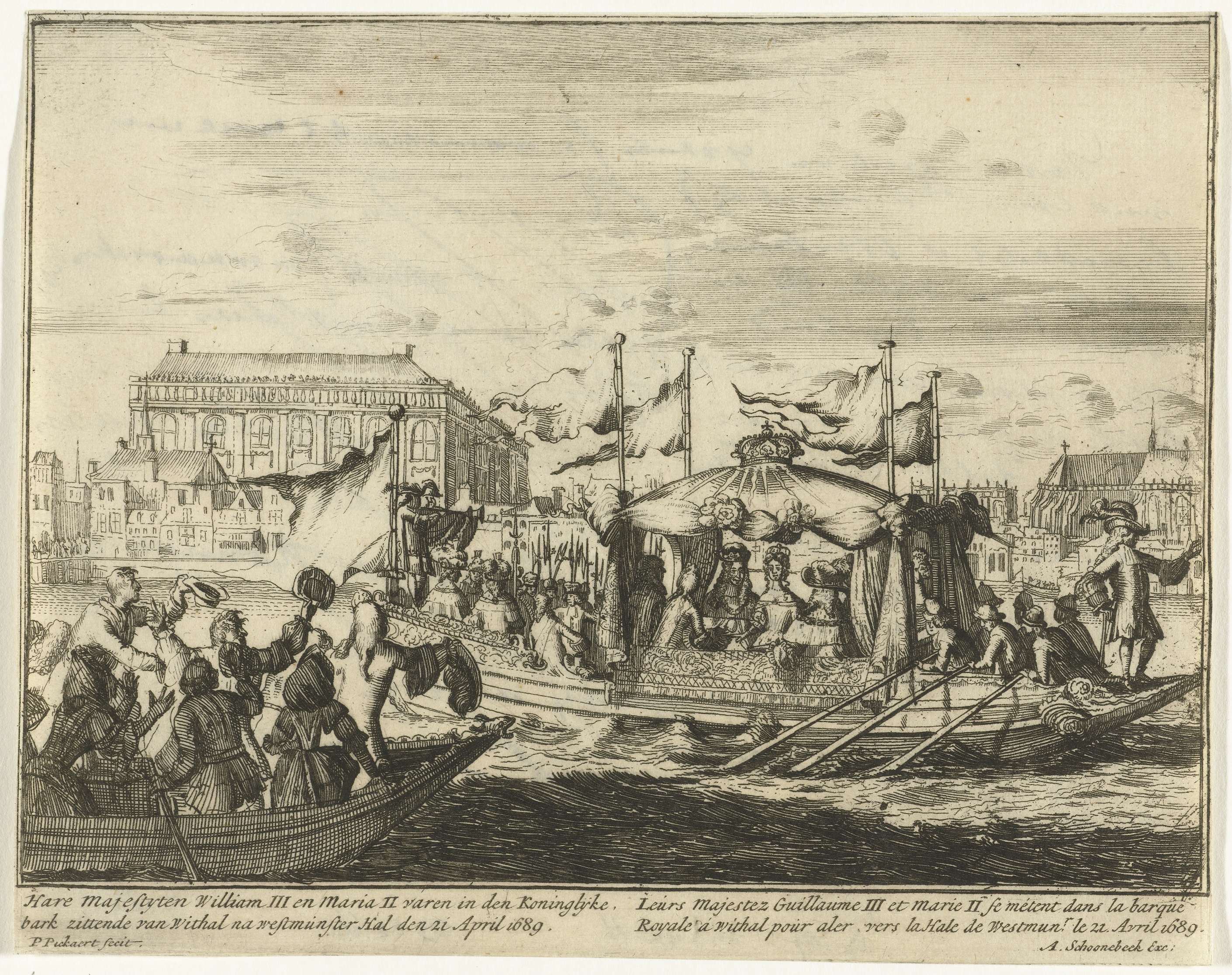 Willem III en Maria II Stuart varen in de koninklijke galei van Whitehall naar Westminster Abbey voor hun kroning, 21 april 1689. Plaat M in de serie 'Engelants schouwtoneel' over de Glorious Revolution 1688-1689 (tweede deel). Met onderschriften in het Nederlands en Frans.