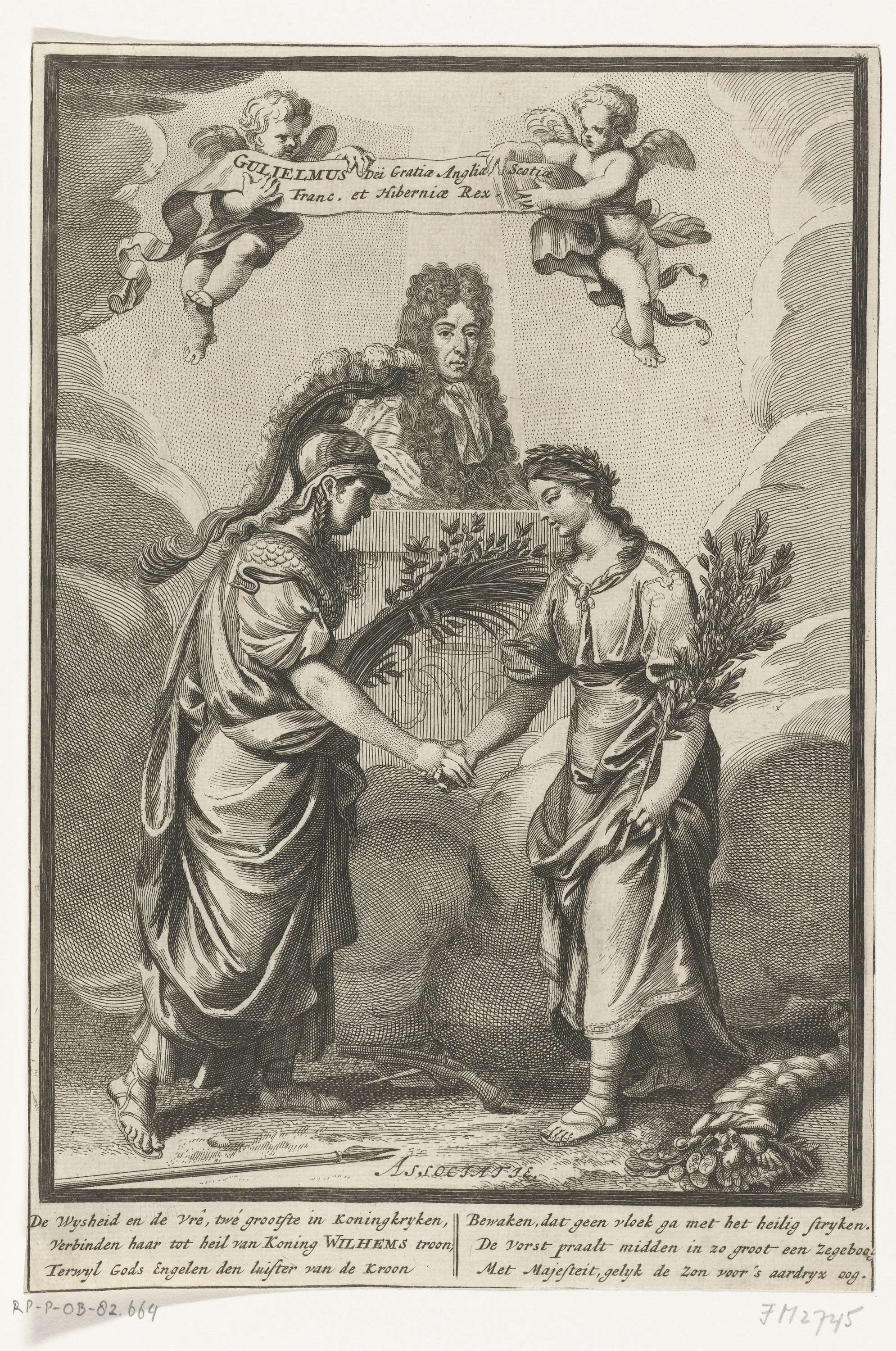 Koning Willem III overziet het verbond tussen Wijsheid en Vrede, 1689. Met onderschrift van zes regels.