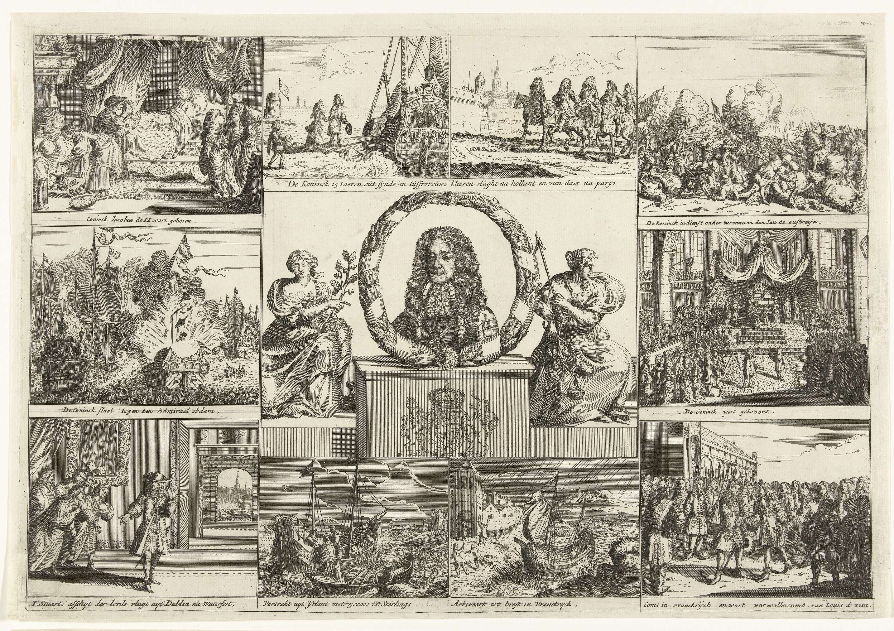 Leven en bedrijf van koning Jacobus II van Engeland, 1690. Blad met centraal een buste van Jacobus II in lauwerkrans vastgehouden door twee allegorische vrouwenfiguren. Hieromheen tien kleinere scènes uit het leven van de koning vanaf zijn geboorte in 1633 tot zijn vlucht naar Frankrijk in 1689. Bij de prent behoort een tekstblad.