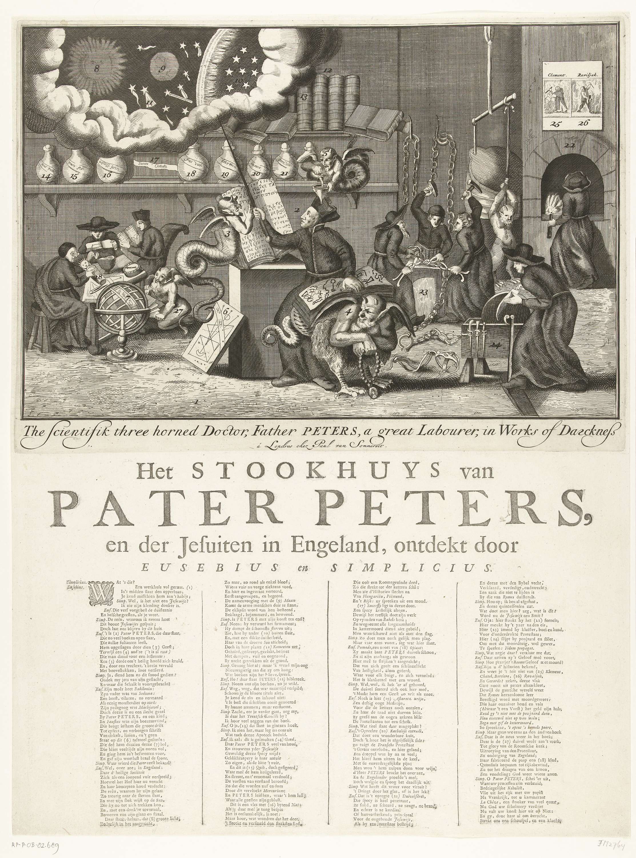 Het laboratorium van pater Peters, 1689. Spotprent op de duivelskunsten van pater Peters (Edward Petre) voorgesteld in de werkplaats van een alchemist waar katholieken en duivels met allerlei projecten bezig zijn. Centraal roept pater Peters met hulp van duivels en toverboeken de zon, maan en kometen op. Links is het molenaarskind gefabriceerd, rechts slijpt een ...