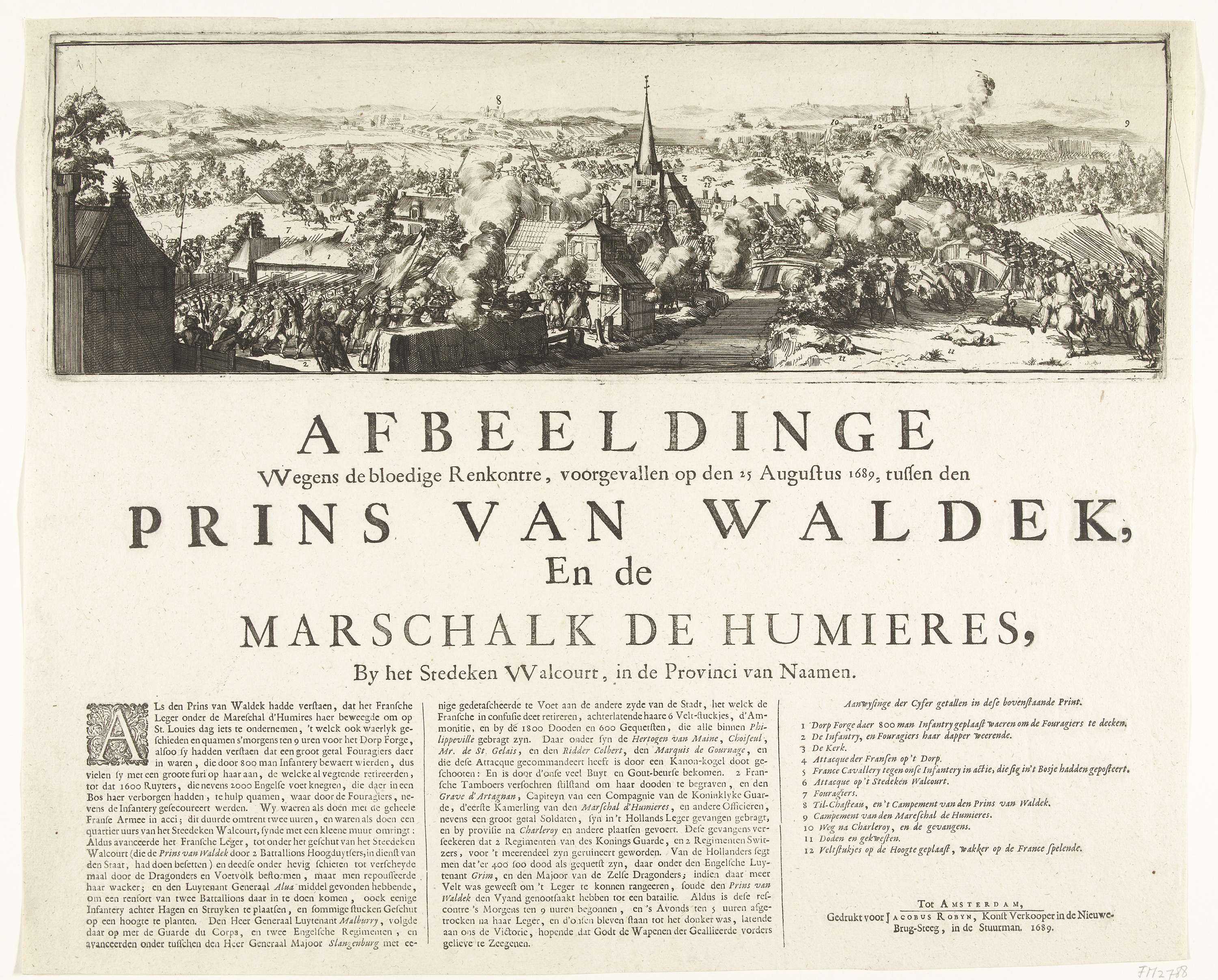 Gevechten bij het plaatsje Walcourt in de omgeving van Charleroi tussen de geallieerden onder Georg Friedrich, prins van Waldeck-Eisenberg en het Franse leger onder maarschalk Louis de Crévant, hertog van Humières, 25 augustus 1689. Onder de plaat in 3 kolommen een beschrijving en de legenda 1-12.