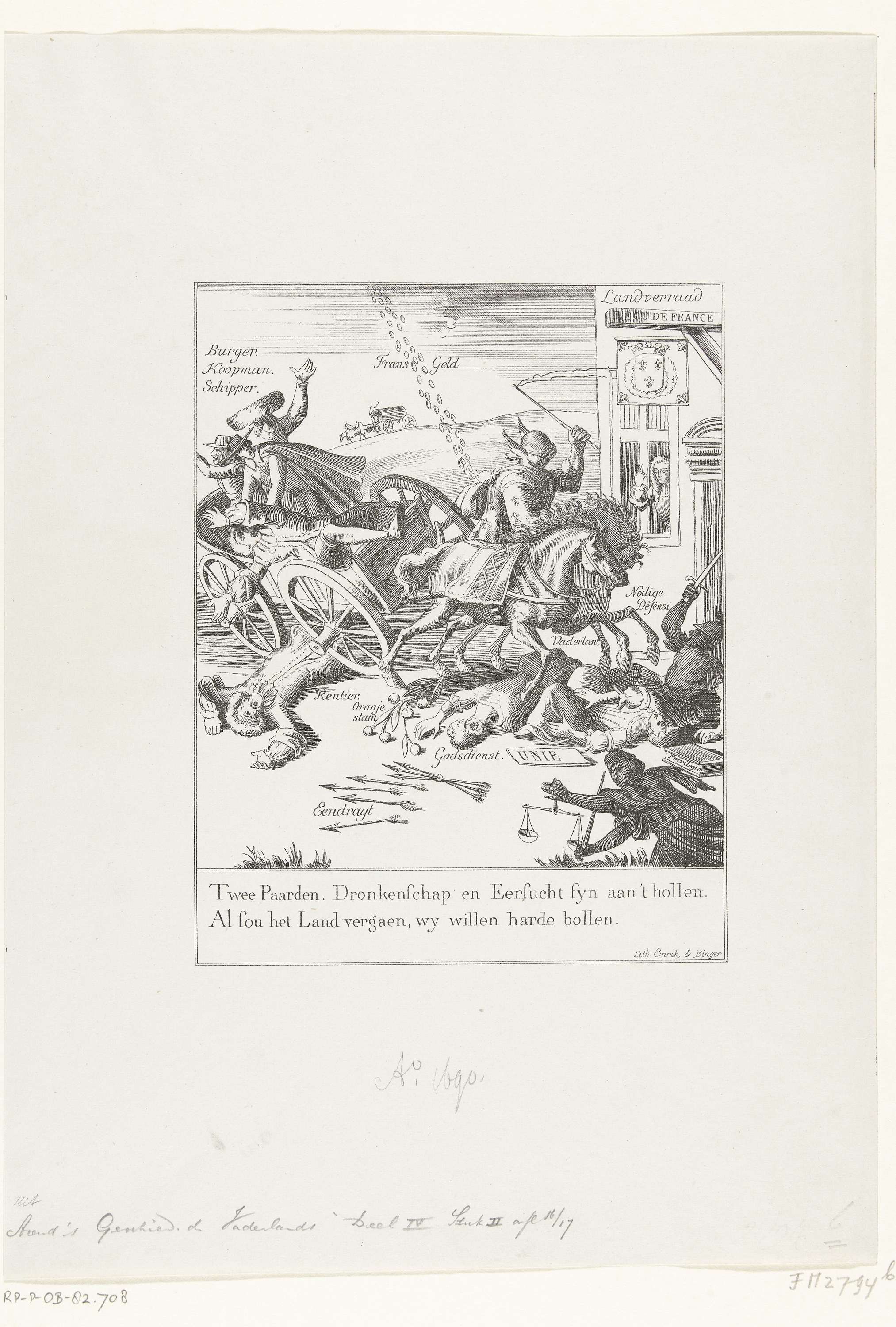 Reproductie van een spotprent op onenigheid tussen Willem III en de stad Amsterdam in 1690 wegens vermeende Fransgezindheid van de stad. Allegorie met een omvallende koets gevoerd door een geblinddoekte ruiter wiens mantel versierd is met franse lelies en getrokken door de twee op hol geslagen paarden Dronkenschap en Eerzucht. De paarden vertrappen Godsdienst, oranjeappels, ...