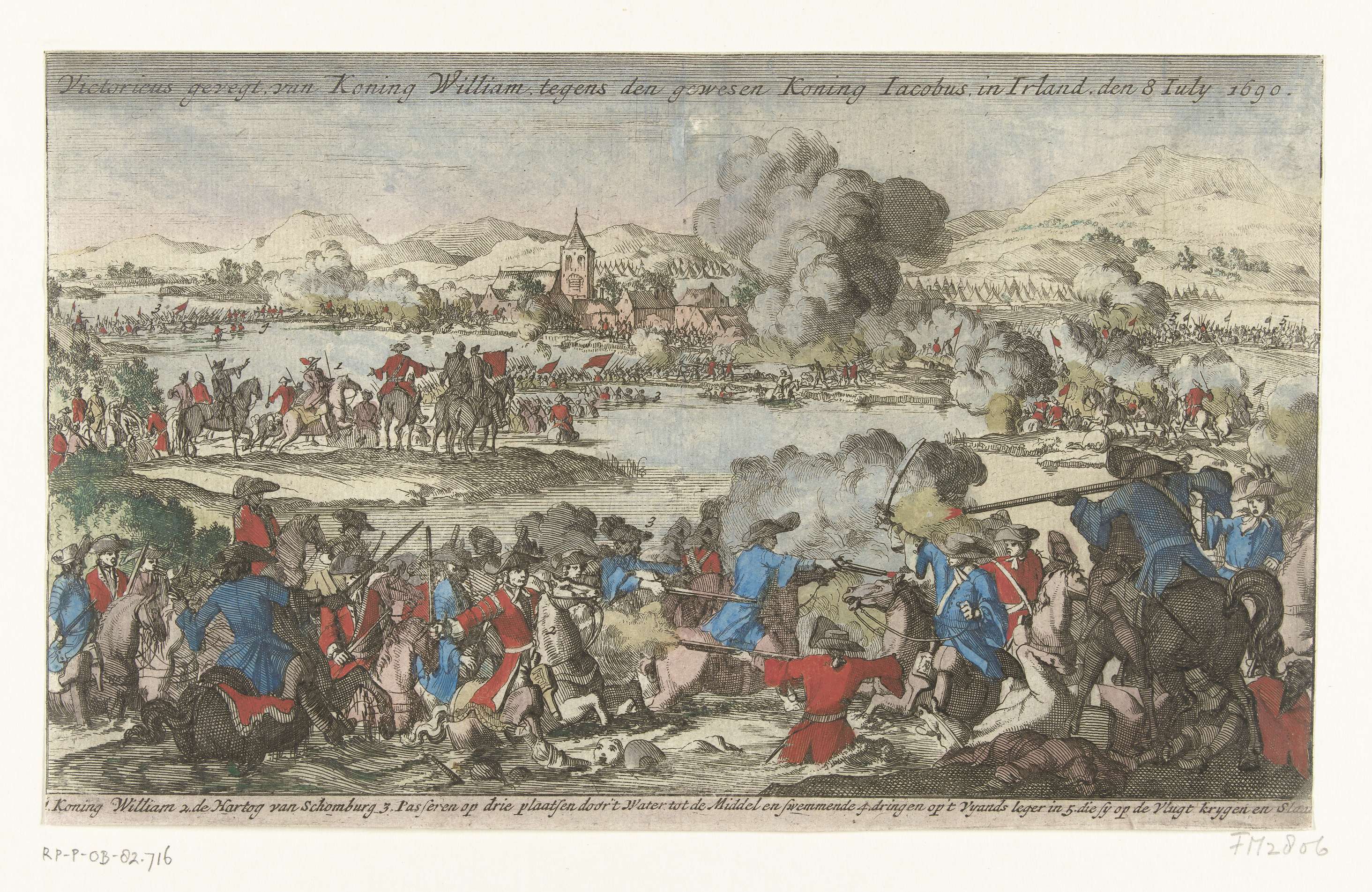 Slag bij de rivier de Boyne op 11 juli 1690, waarbij het leger van Willem III en overwinning behaalt op de katholieken onder Jacobus II. In het midden de hertog van Schomberg te paard die in de slag zou sneuvelen. In het onderschrift de legenda 1-5.