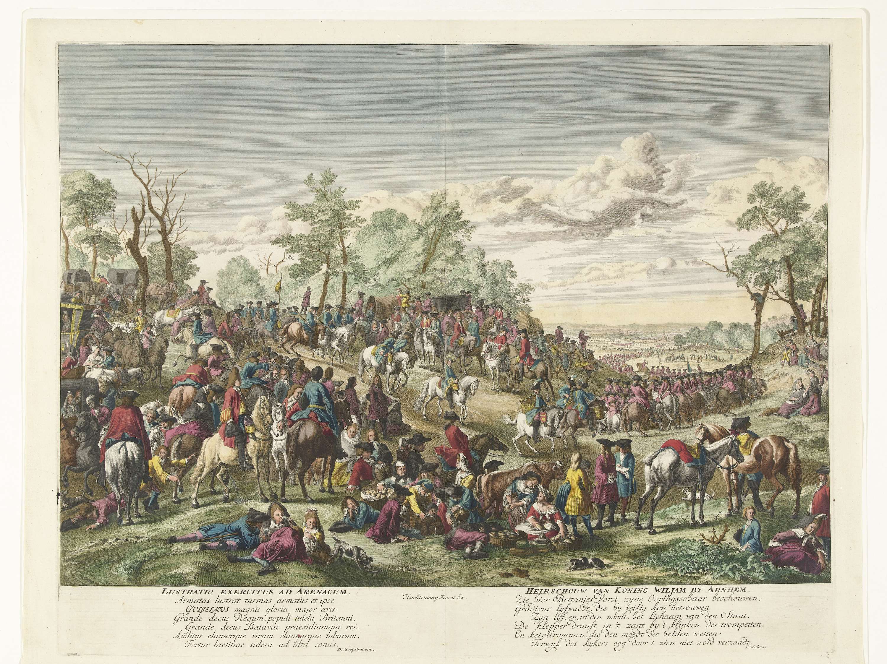 Inspectie van de troepen door koning Willem III bij Arnhem, 17 maart 1691. Ruiters paraderen voorbij de vorst die te paard tussen zijn officieren zit. Feestelijke gebeurtenis met gezinnen die zich vermaken met eten en drinken. Rechts doet een vrouw haar behoefte tussen struiken. In het onderschrift twee verzen van zes regels in het Latijn ...