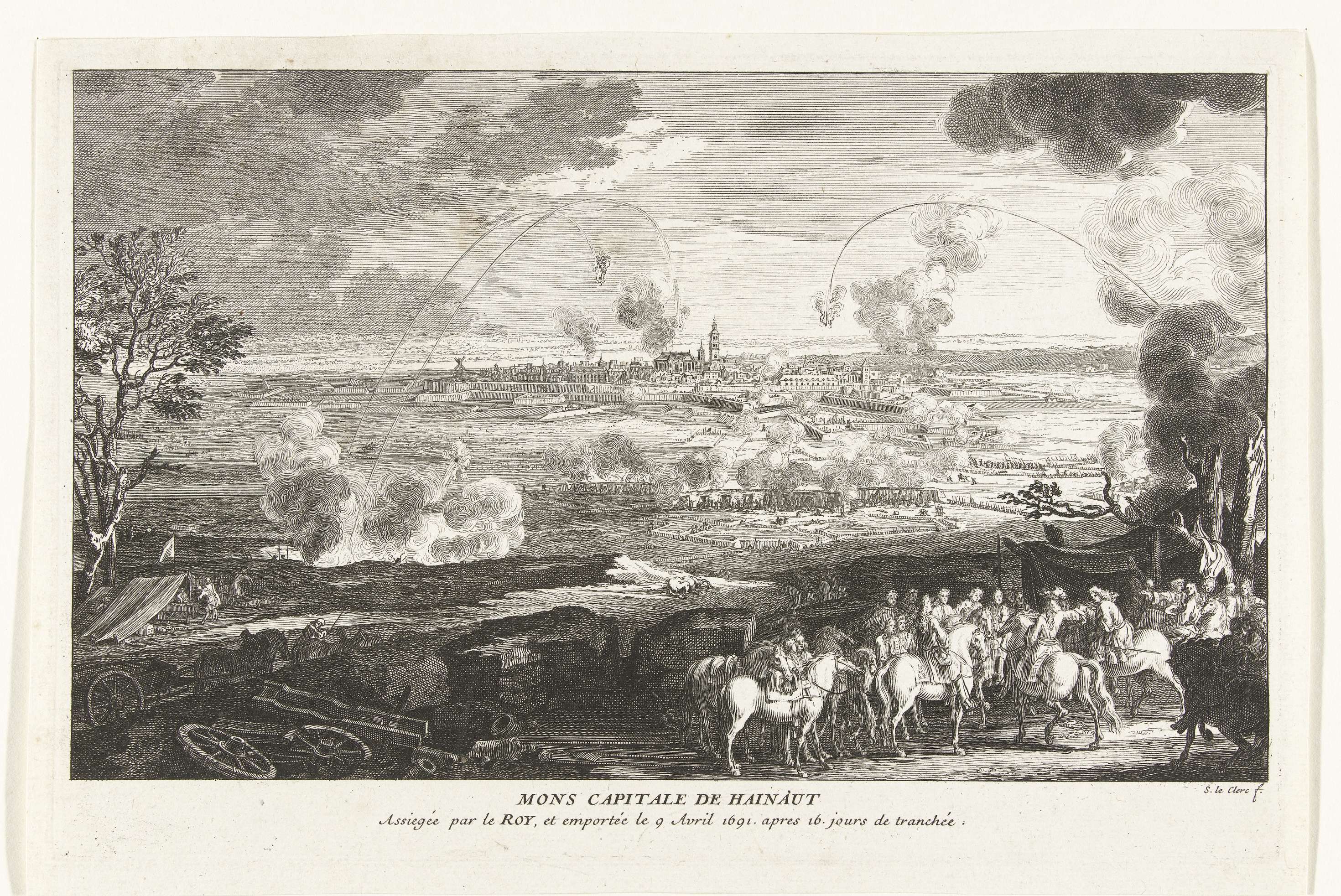 Beleg van Bergen (Mons) in Henegouwen door de Fransen vanaf 15 maart en ingenomen op 10 april 1691. Gezicht op de belegerde stad met de bombardementen door de Fransen.