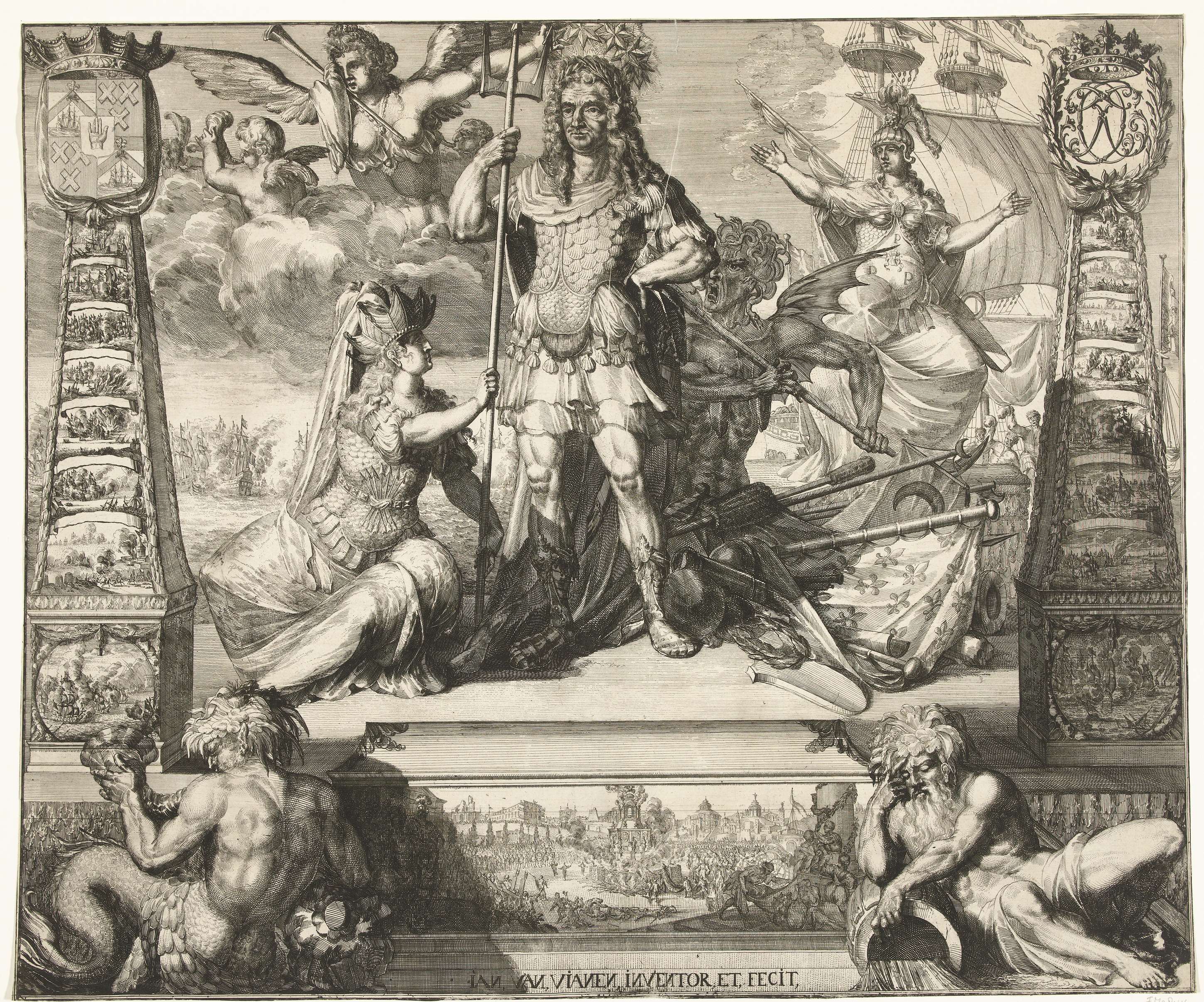Allegorie ter ere van admiraal Cornelis Tromp als Neptunus, bij zijn overlijden op 29 mei 1691. Aan zijn voeten de Nederlandse Maagd met schepenkroon die hem de drietand aanreikt, achter hem de verslagen Tweedracht met slangenhaar, in de wolken de huilende Faam. Links en rechts zuilen met afbeeldingen van zeeslagen. Onderaan een riviergod en triton ...