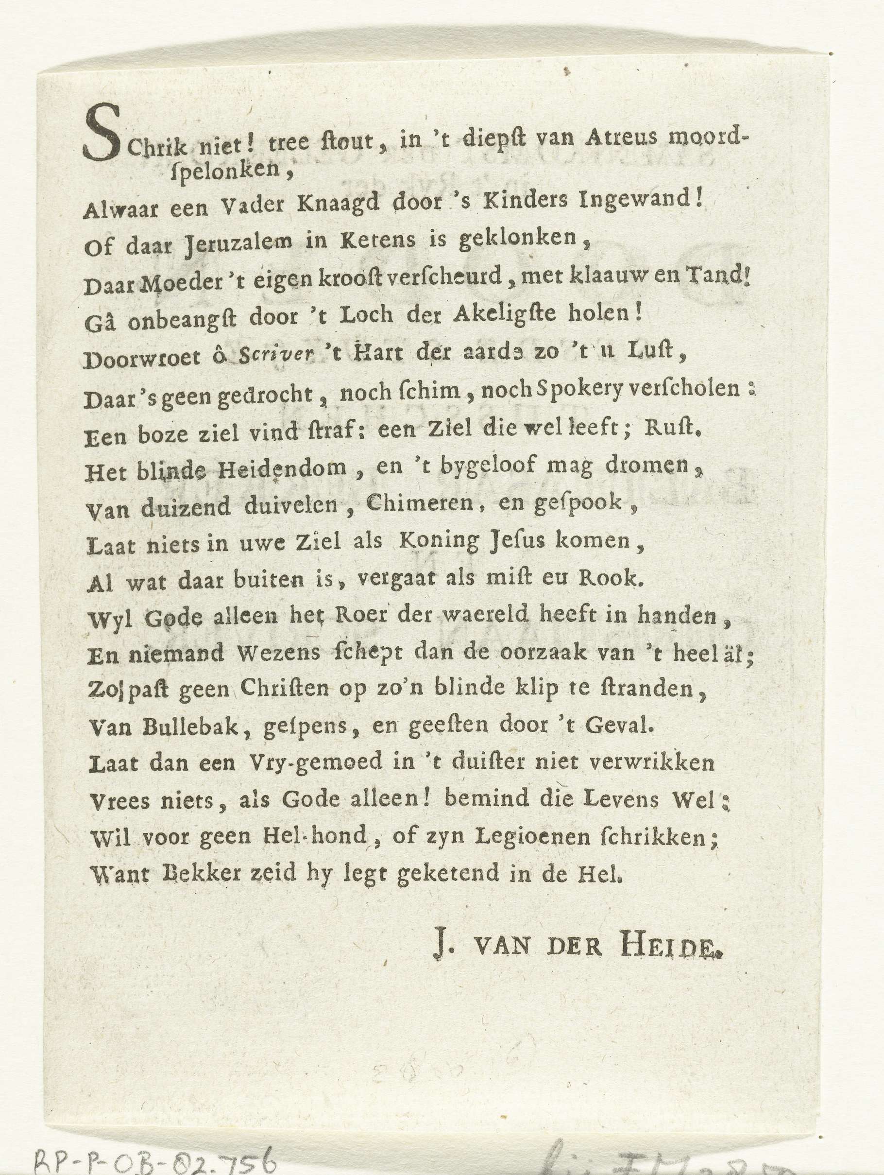 Vers op de ontmoeting in het dodenrijk tussen de geleerden Christiaan Scriver en Balthasar Bekker. Tekstblad met titelpagina en vers op beide zijden. Onderdeel van een groep bladen in verband met de uitgave in 1691 van het boek: De betoverde weereld, van Balthasar Bekker.