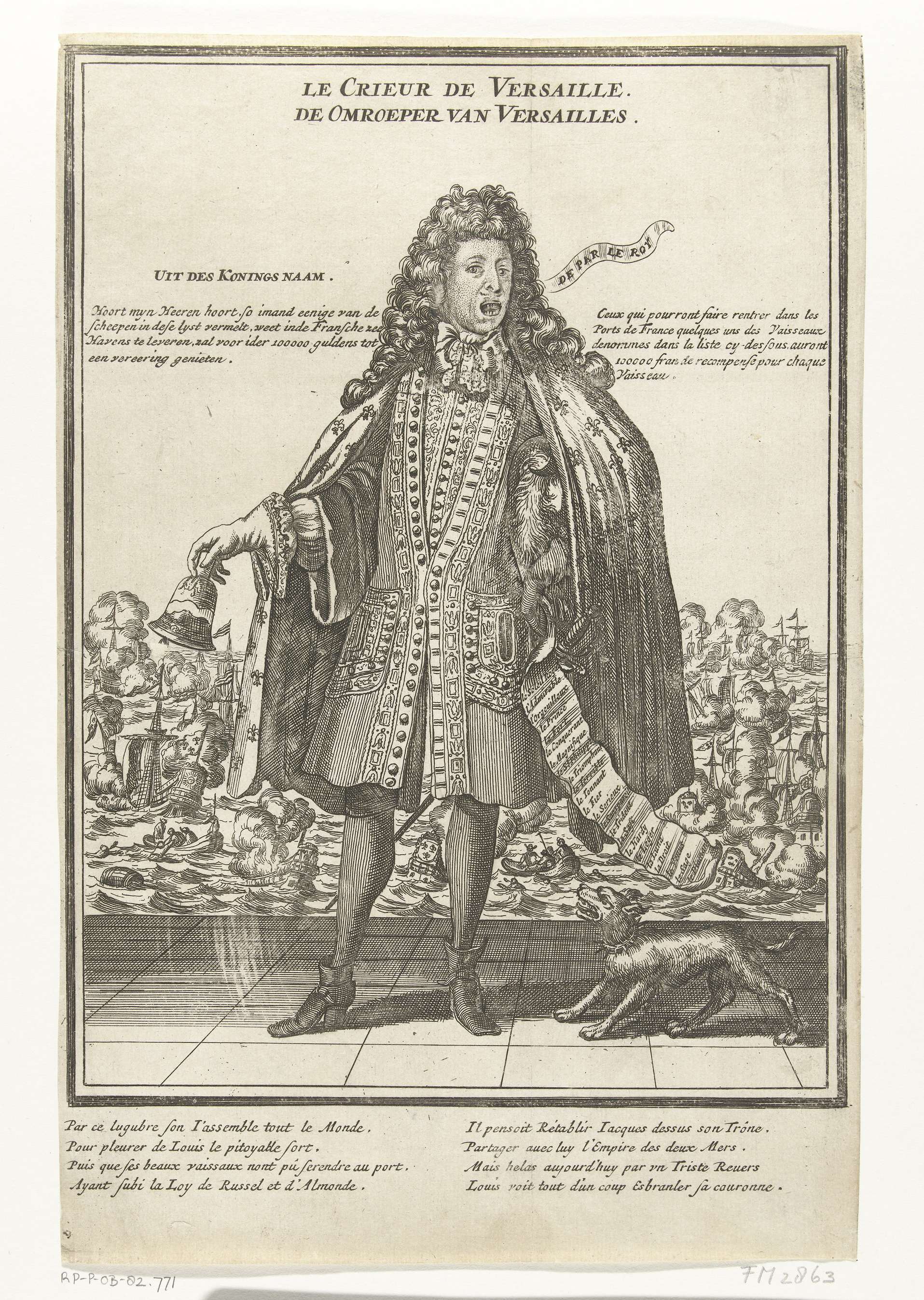 De Omroeper van Versailles. Spotprent op de Franse koning Lodewijk XIV die als een stadsomroeper het nieuws brengt van de nederlaag in de zeeslag bij Kaap la Hogue waarbij de Fransen onder admiraal de Tourville werden verslagen door de gecombineerde vloot van Engeland en Holland onder de admiralen Russel en Almonde, 29 mei t/m 3 ...