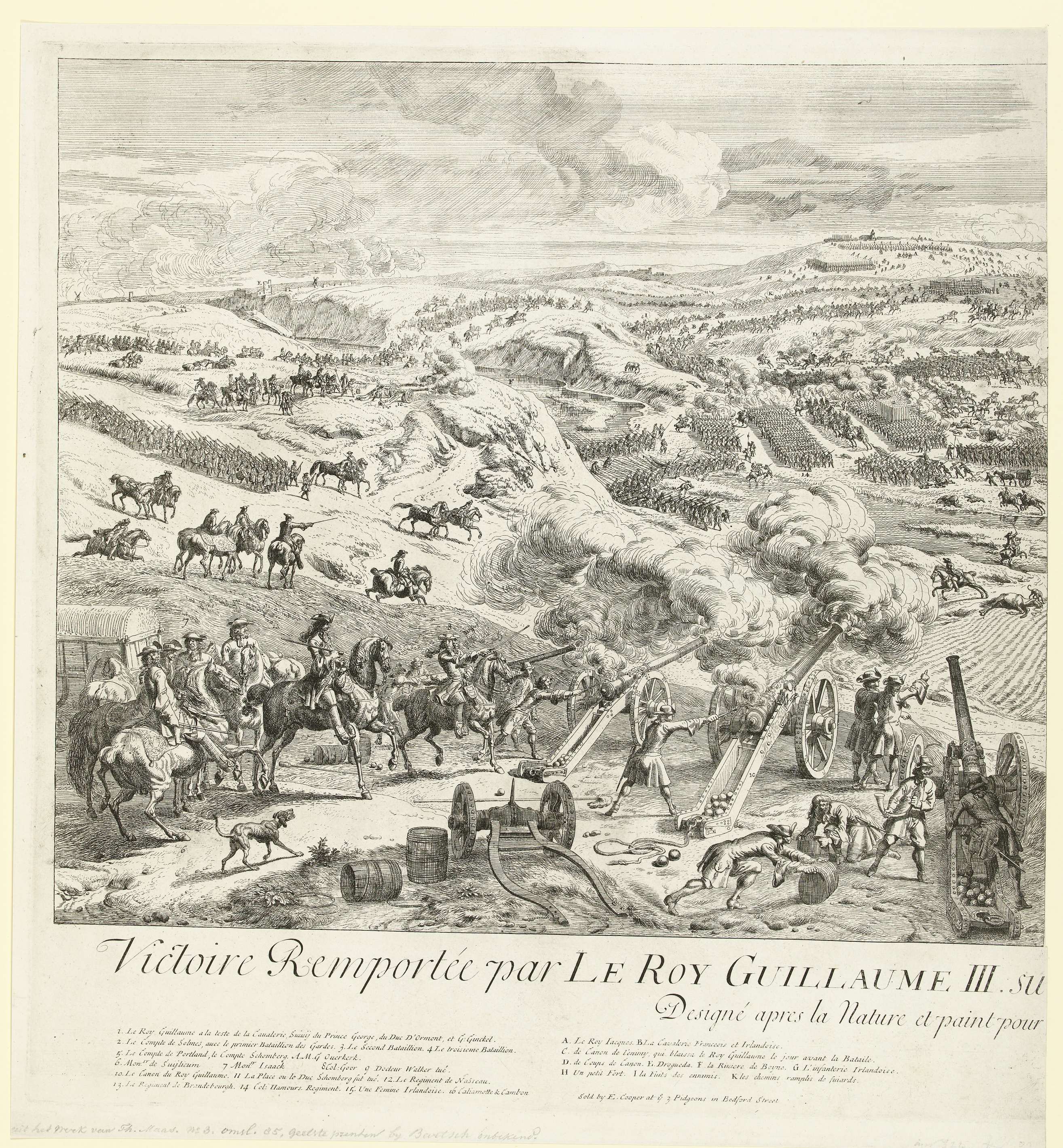 Linkerblad van een grote voorstelling op twee losse bladen van de slag bij de rivier de Boyne op 11 juli 1690, waarbij het leger van Willem III een overwinning behaalt op de katholieken onder Jacobus II. Op de voorgrond vurende kanonnen, links in de verte Drogheda. In het onderschrift de legenda's 1-16 en A-K in ...