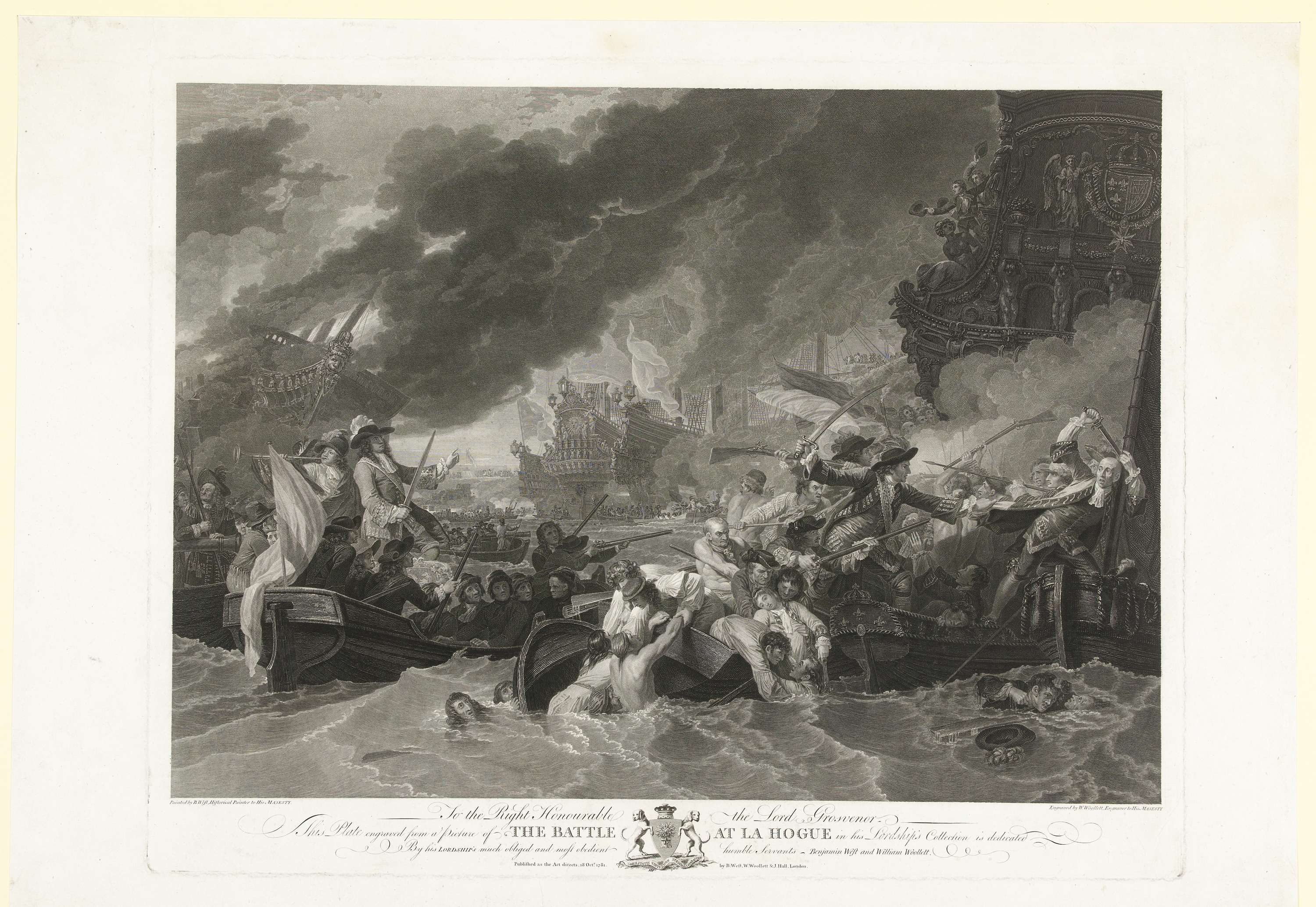 Aanvallen van de gecombineerde Engels-Hollandse vloten onder Russel en Almonde op de Fransen onder Tourville bij de Slag bij Kaap la Hogue, 29 mei - 3 juni 1692. Afgebeeld is het moment van Tourville van een boot in een andere wil stappen en vastgegrepen wordt door een Engelsman wiens hand hij met zijn zwaard zal ...