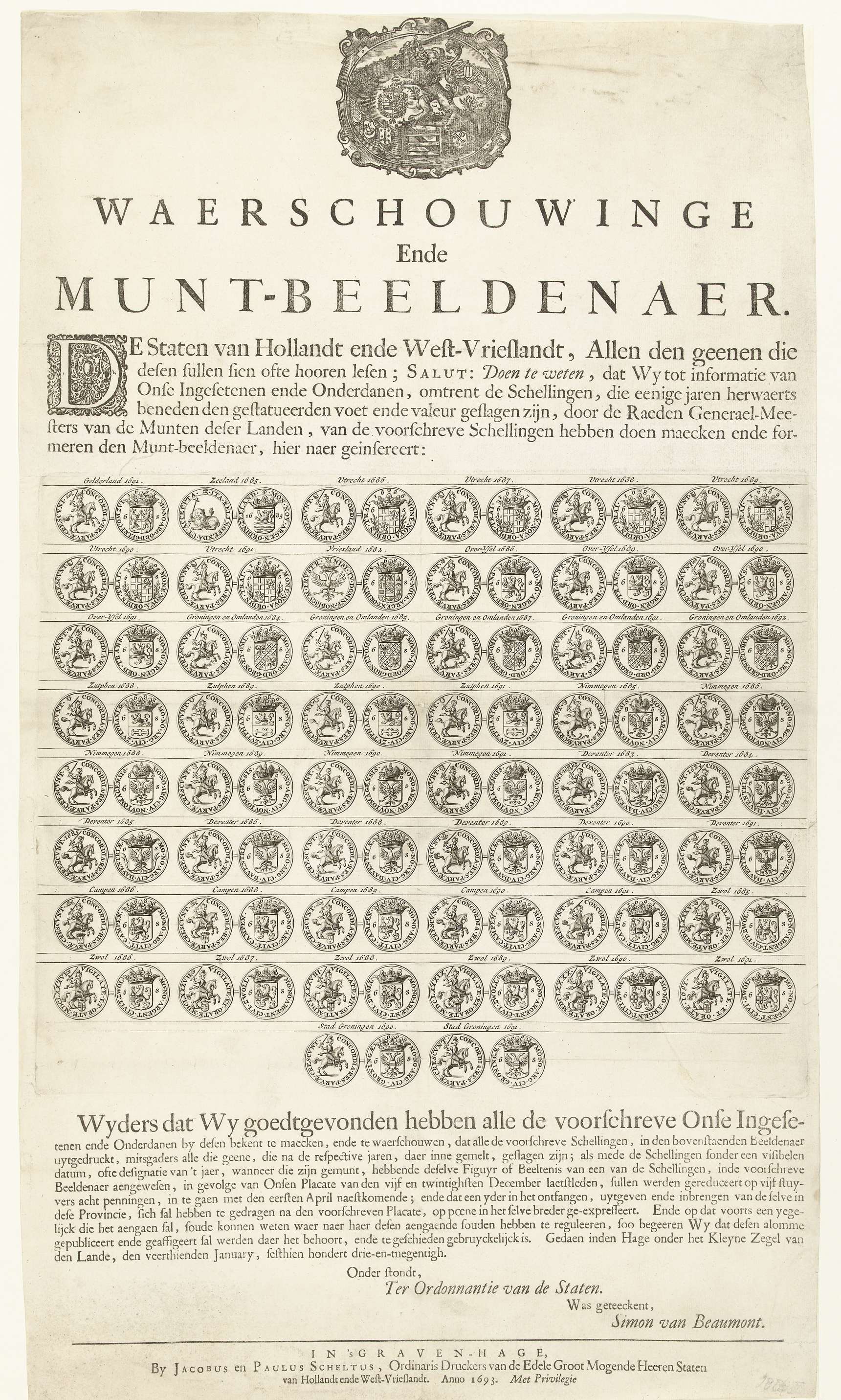 Herstel en reductie der Schellingen, 1692. Blad met een overzicht van de 50 schellingen die volgens het besluit van de Staten van Holland en West-Friesland, in te gaan op 1 april 1693, een waarde hebben van vijf stuivers en acht penningen. Bovenaan een vignet met de Hollandse Tuin.