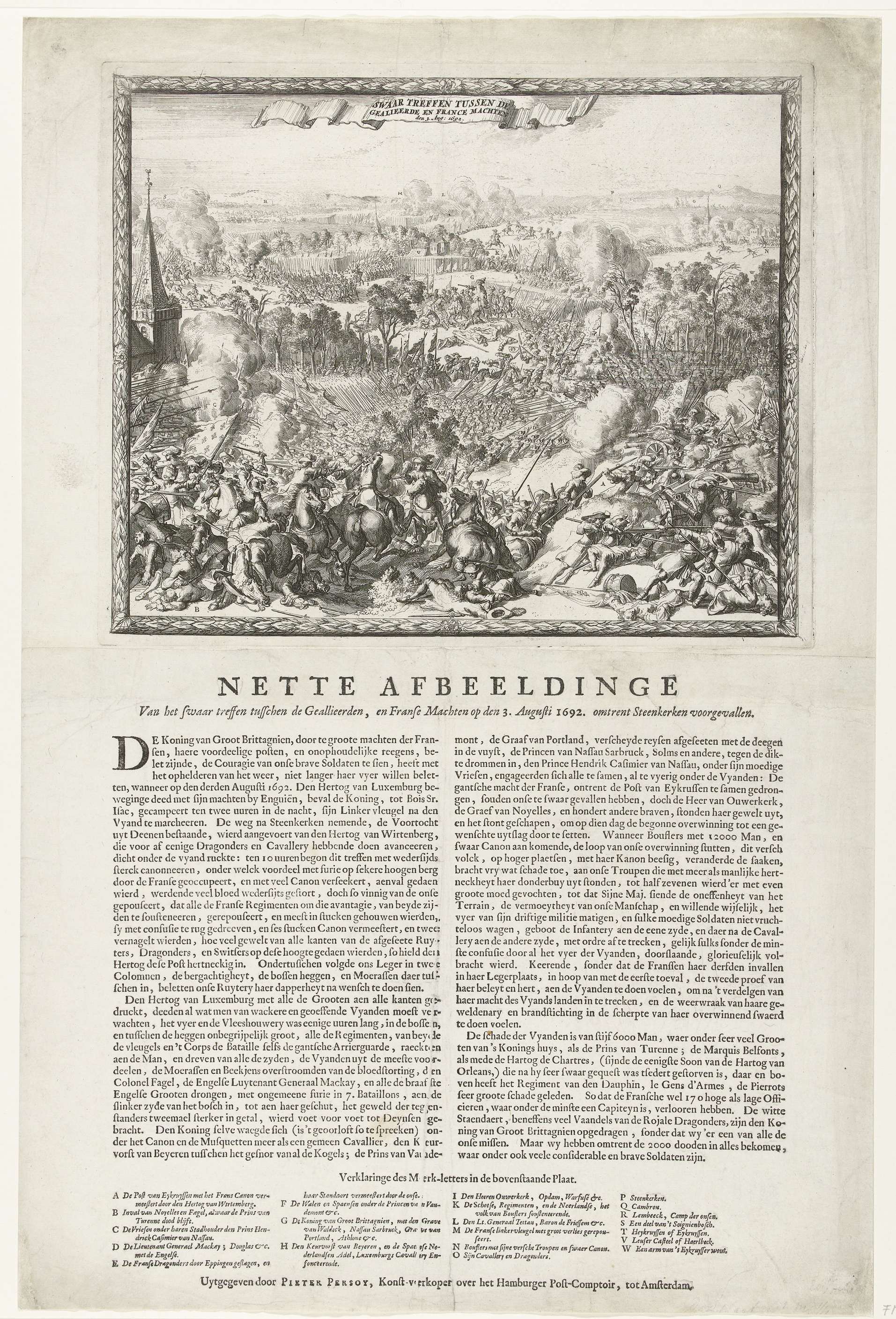 Slag bij Steenkerke in Henegouwen waarbij het Franse leger onder de duc de Luxembourg de geallieerden onder koning Willem III versloeg, 3 augustus 1692. Op een blad geplakt onder de prent een beschrijving van de veldslag in twee kolommen met de legenda A-W.