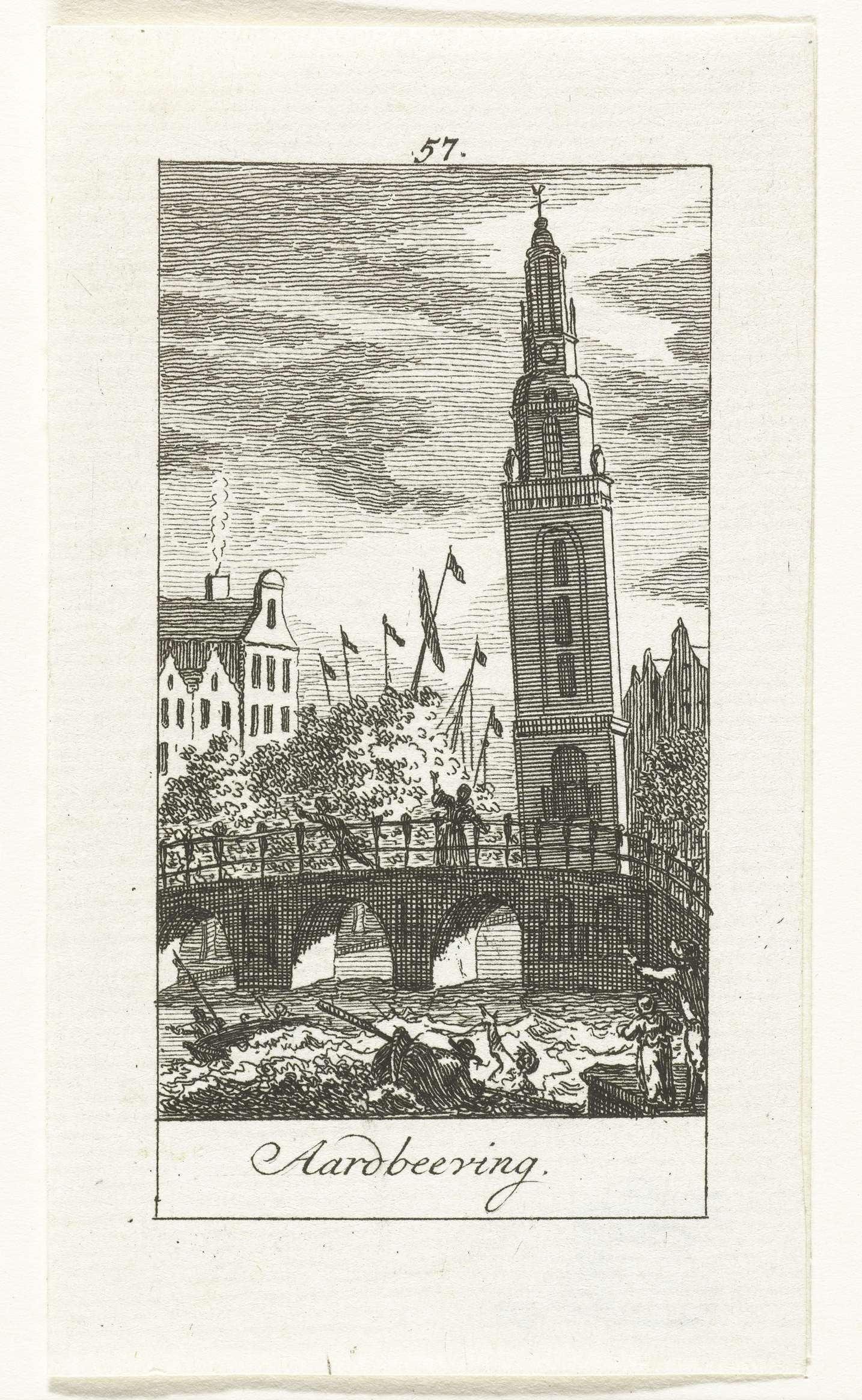 Gezicht op de scheefstaande Jan Roodenpoortstoren aan de Singel te Amsterdam tijdens de aardbeving van Verviers op 18 september 1692. Genummerd bovenaan: 57.