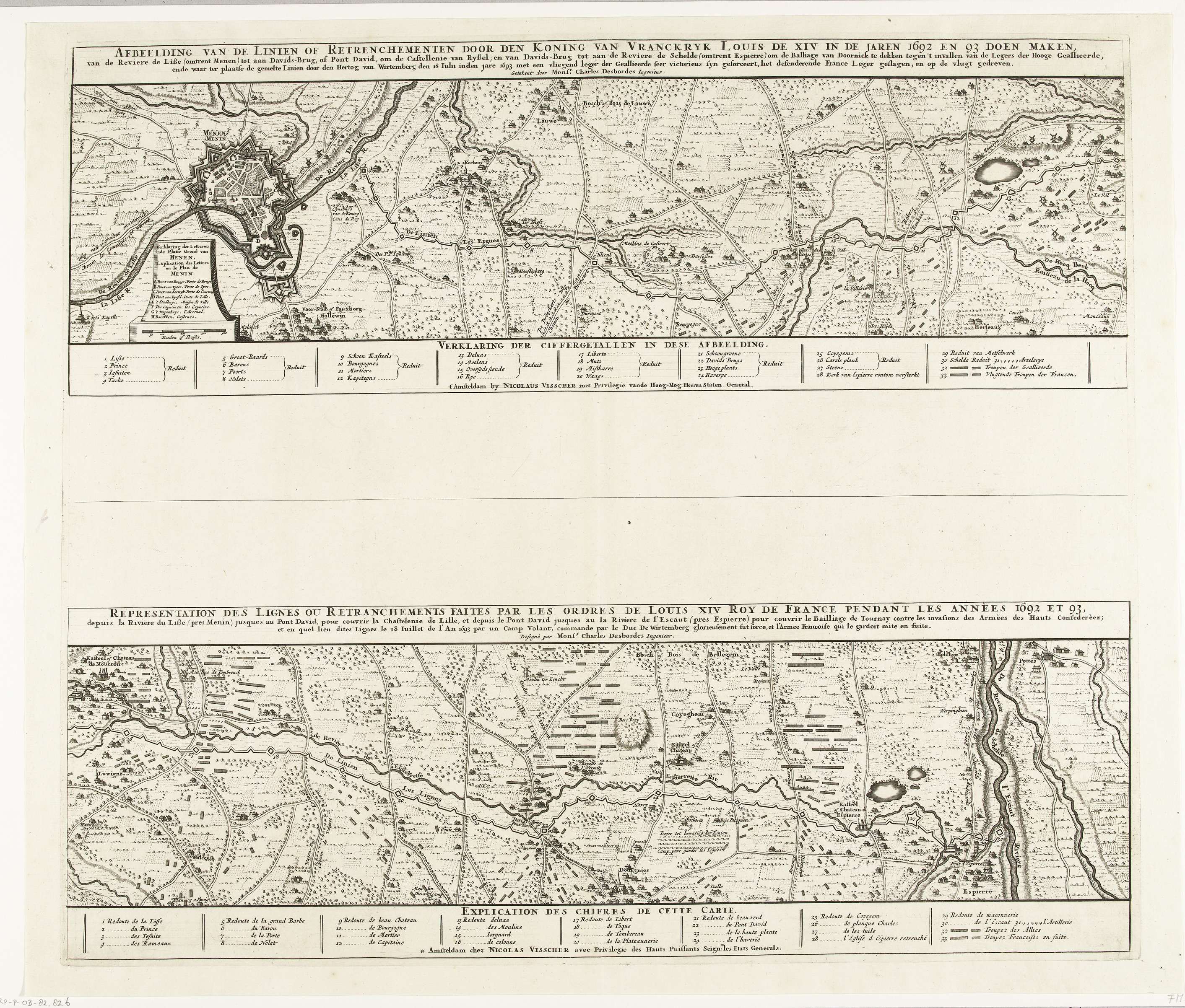 Blad met twee kaarten van de verdedigingslinies van de Fransen in de Zuidelijke Nederlanden nabij Menen, 1692-1693. Onder elke kaart de verklaringen van de cijfers in de voorstellingen.
