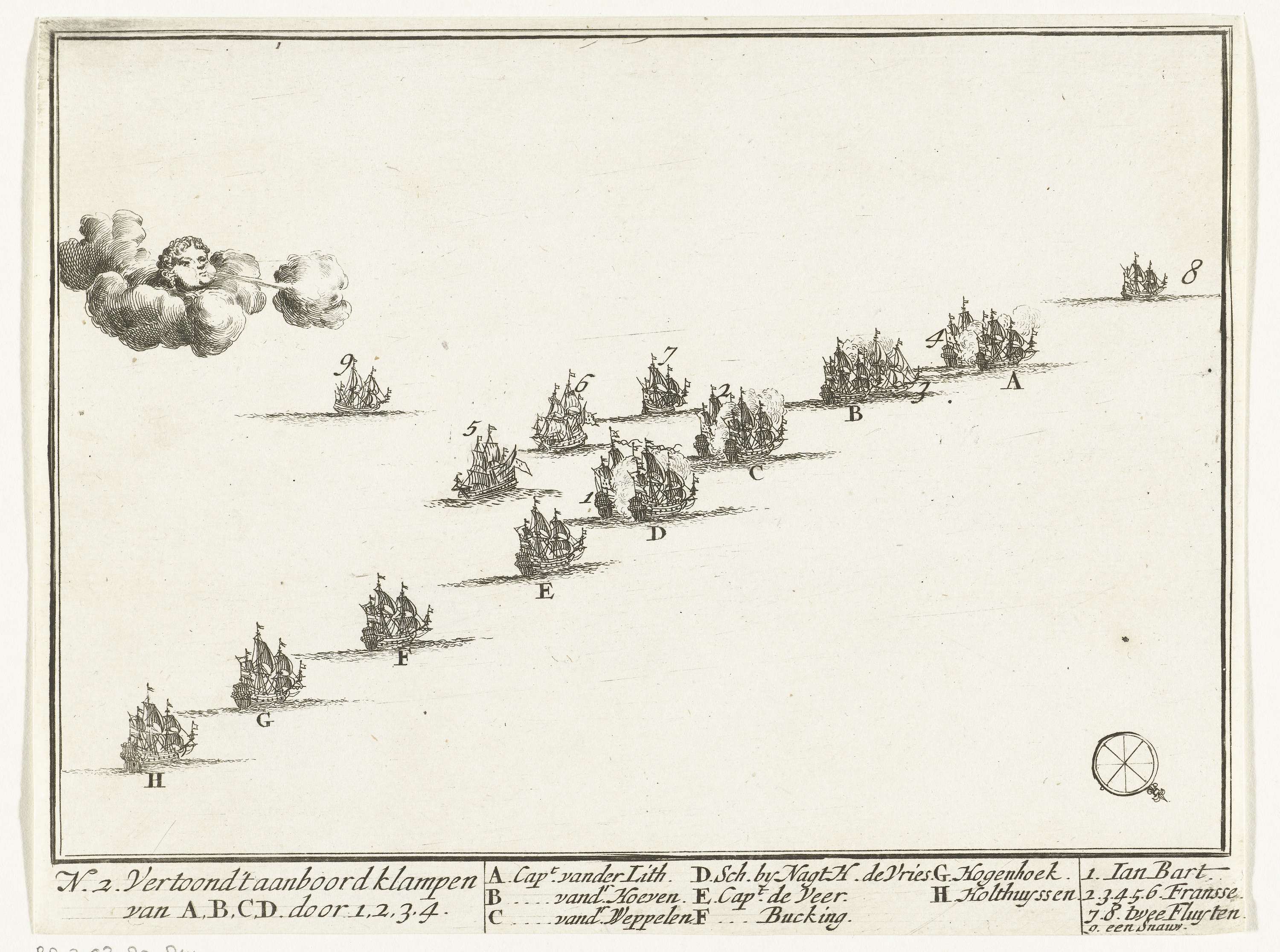 Zeegevecht tussen Hollanders en Fransen op de Noordzee. Plaat nr. 2 in een serie van 14 genummerde platen van een zeegevecht voorgevallen tussen een Hollands eskader onder Hidde Sjoerds de Vries en Franse schepen onder Jan Bart op de Noordzee, 29 juni 1694.
