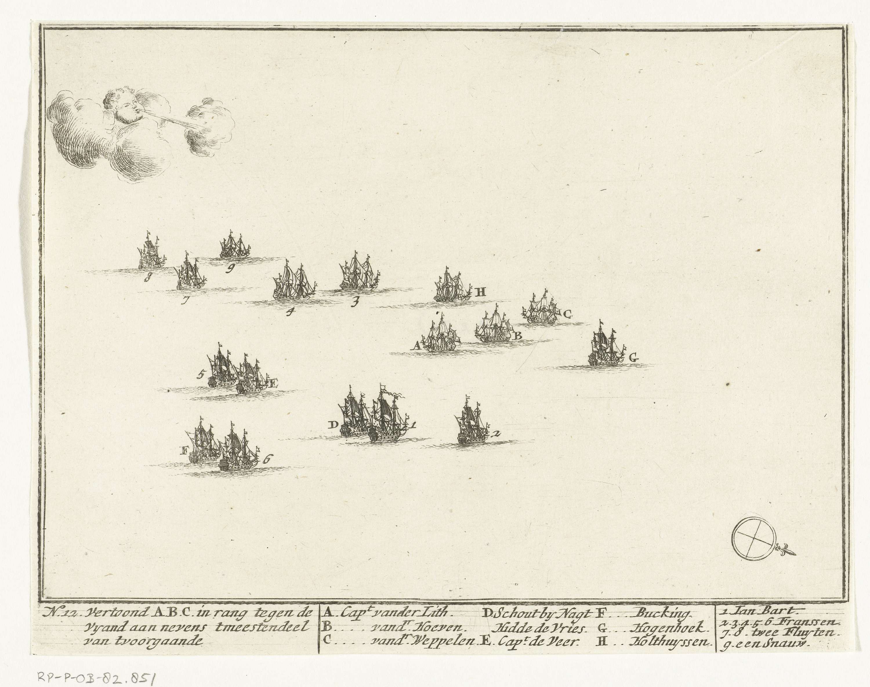 Zeegevecht tussen Hollanders en Fransen op de Noordzee. Plaat nr. 12 in een serie van 14 genummerde platen van een zeegevecht voorgevallen tussen een Hollands eskader onder Hidde Sjoerds de Vries en Franse schepen onder Jan Bart op de Noordzee, 29 juni 1694.
