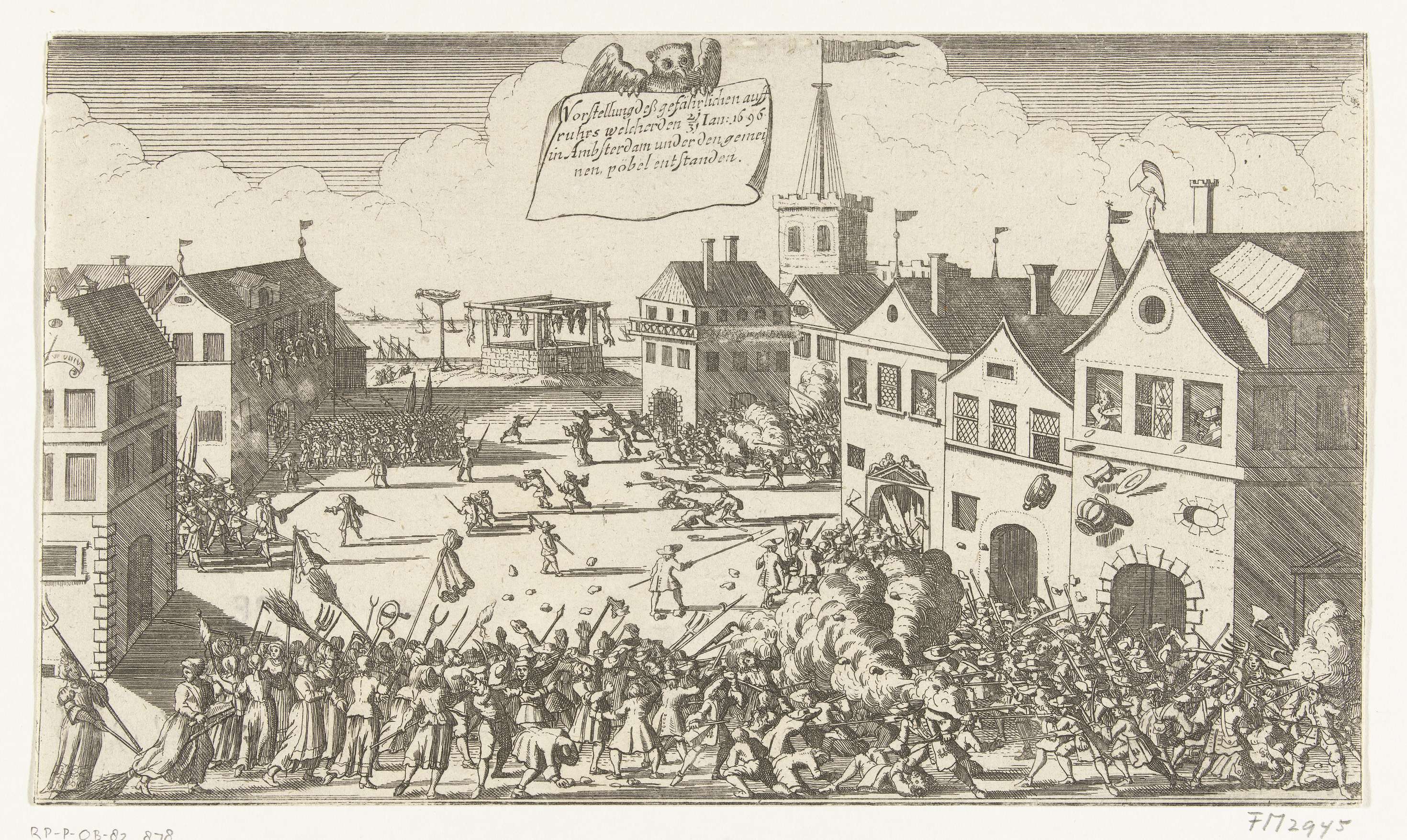 Het Aansprekersoproer te Amsterdam, 31 januari-1 februari 1696. De schutterij vuurt op de menigte, huizen worden geplunderd, op de achtergrond ophangingen. In de lucht een uil met de titel. Geheel onrealistische weergave van de gebeurtenissen.