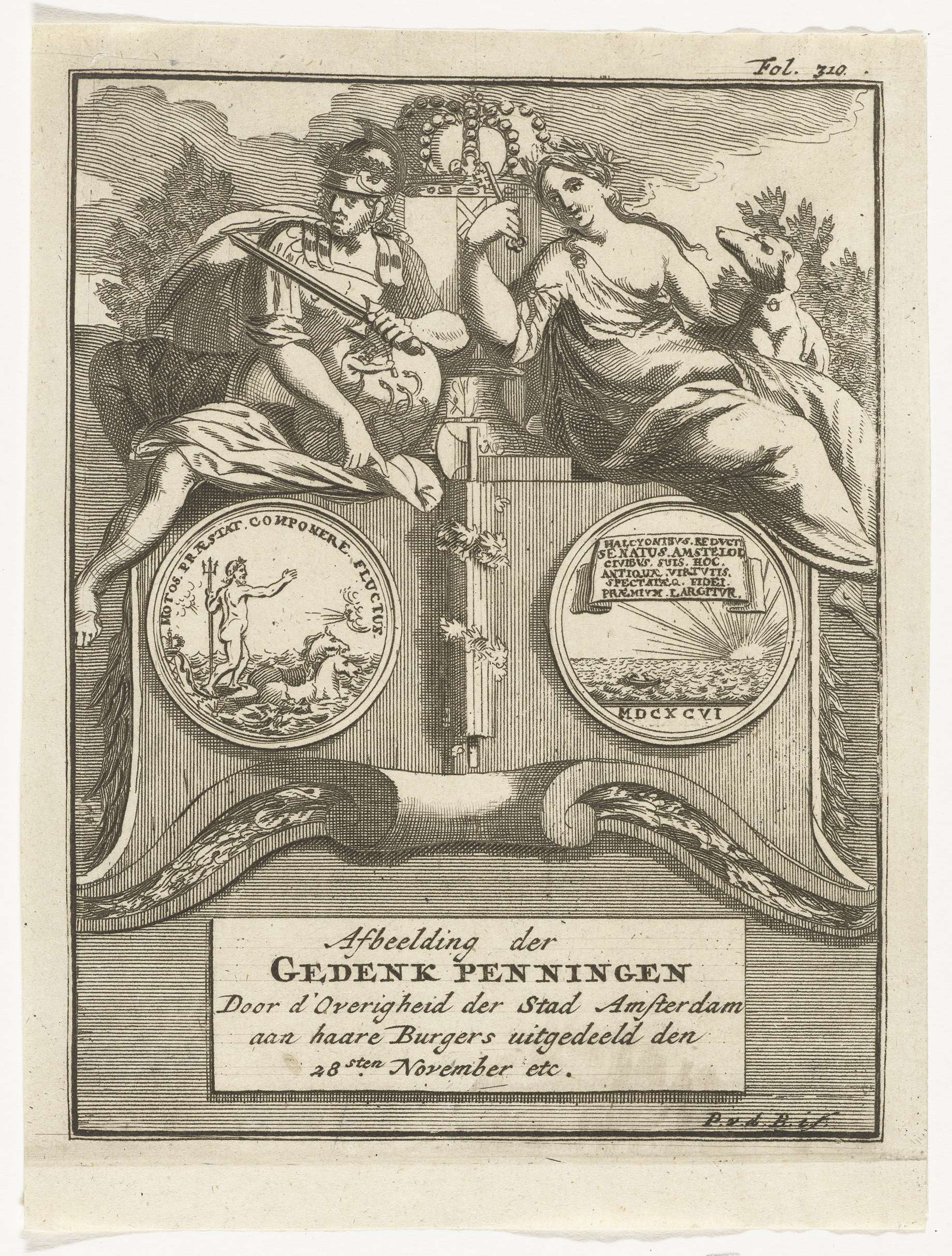 Allegorische voorstelling met de beide zijden van de gedenkpenning uitgedeeld op 28 november 1696 door het gemeentebestuur van de stad Amsterdam aan de leden van schutterij in dank voor het herstellen van de rust tijdens het Aansprekersoproer, 31 januari-1 februari 1696. Gemerkt rechtsboven: Fol. 310.