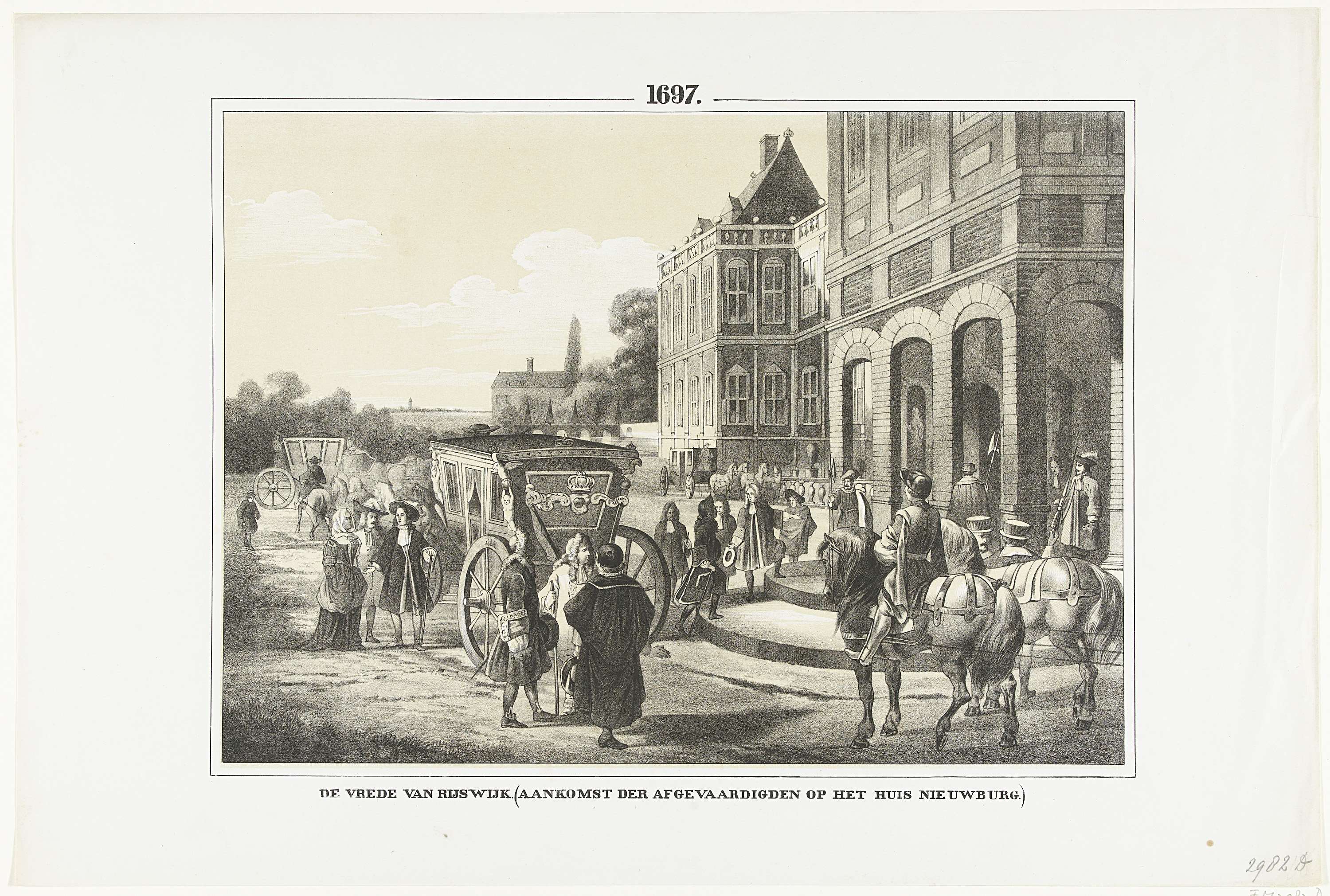 Aankomst van de afgevaardigden voor de vredesonderhandelingen op het Huis ter Nieuburch te Rijswijk, resulterend in de Vrede van Rijswijk gesloten op 20 september 1697 tussen Frankrijk en de geallieerden.