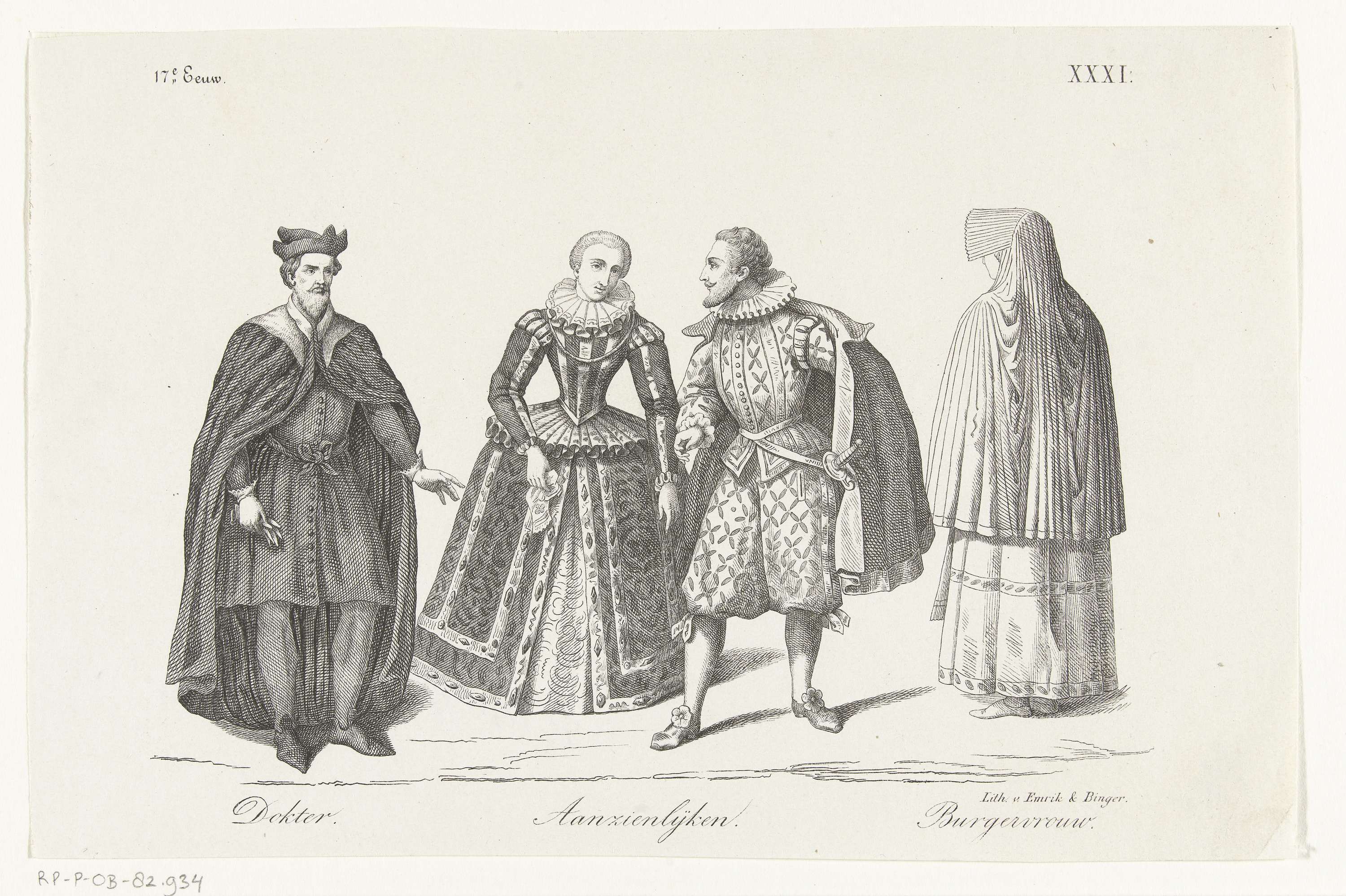 Kleding van Nederlandse mannen en vrouwen in de zeventiende eeuw. Kleding van: Dokter/ Aanzienlijken / Burgervrouw. Genummerd rechtsboven: XXXI.