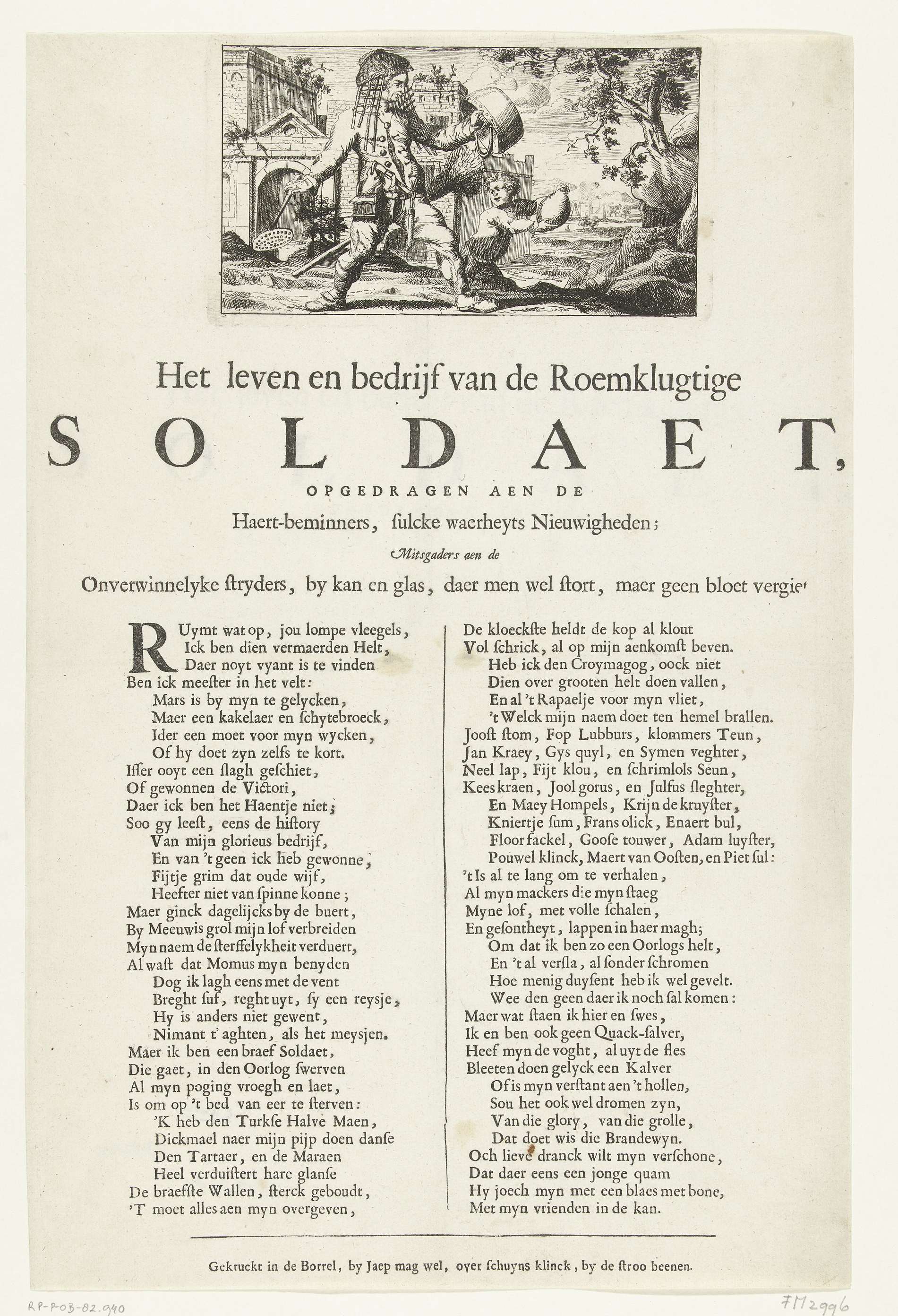 Spotprent op de drankzuchtige soldaat. Dronken soldaat bewapend met schuimspaan en ketel en met een mand op het hoofd. Onder de plaat een vers in twee kolommen.
