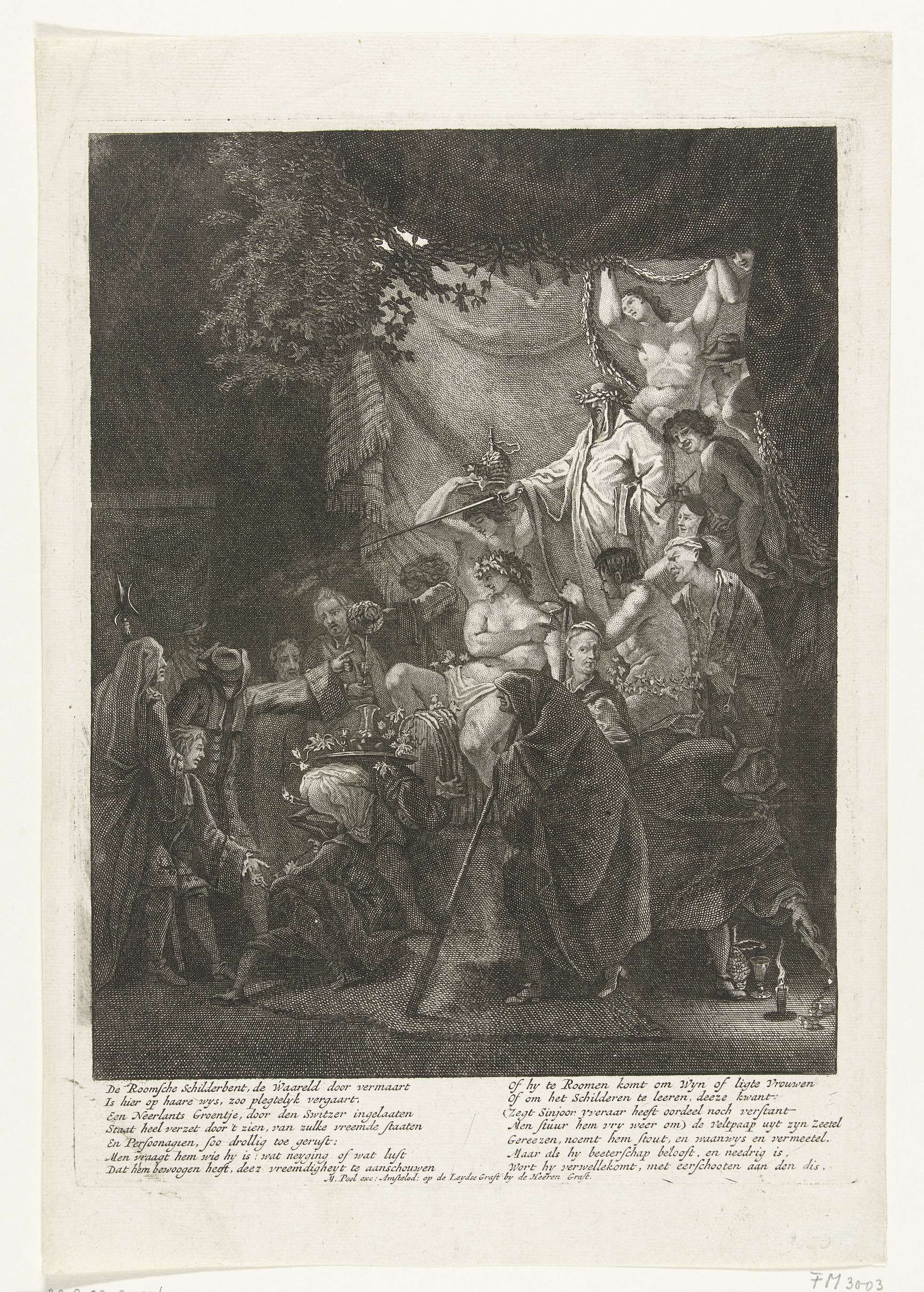 Ontvangst en inwijding van een nieuw lid van de Bentvueghels, ca. 1700. Leden van de bentvogels, de groep van Nederlandse kunstenaars in Rome, verkleed als bacchanten met een priester die met een stok naar het nieuwe lid wijst. In het onderschrift 2 keer 7 regels in het Nederlands.