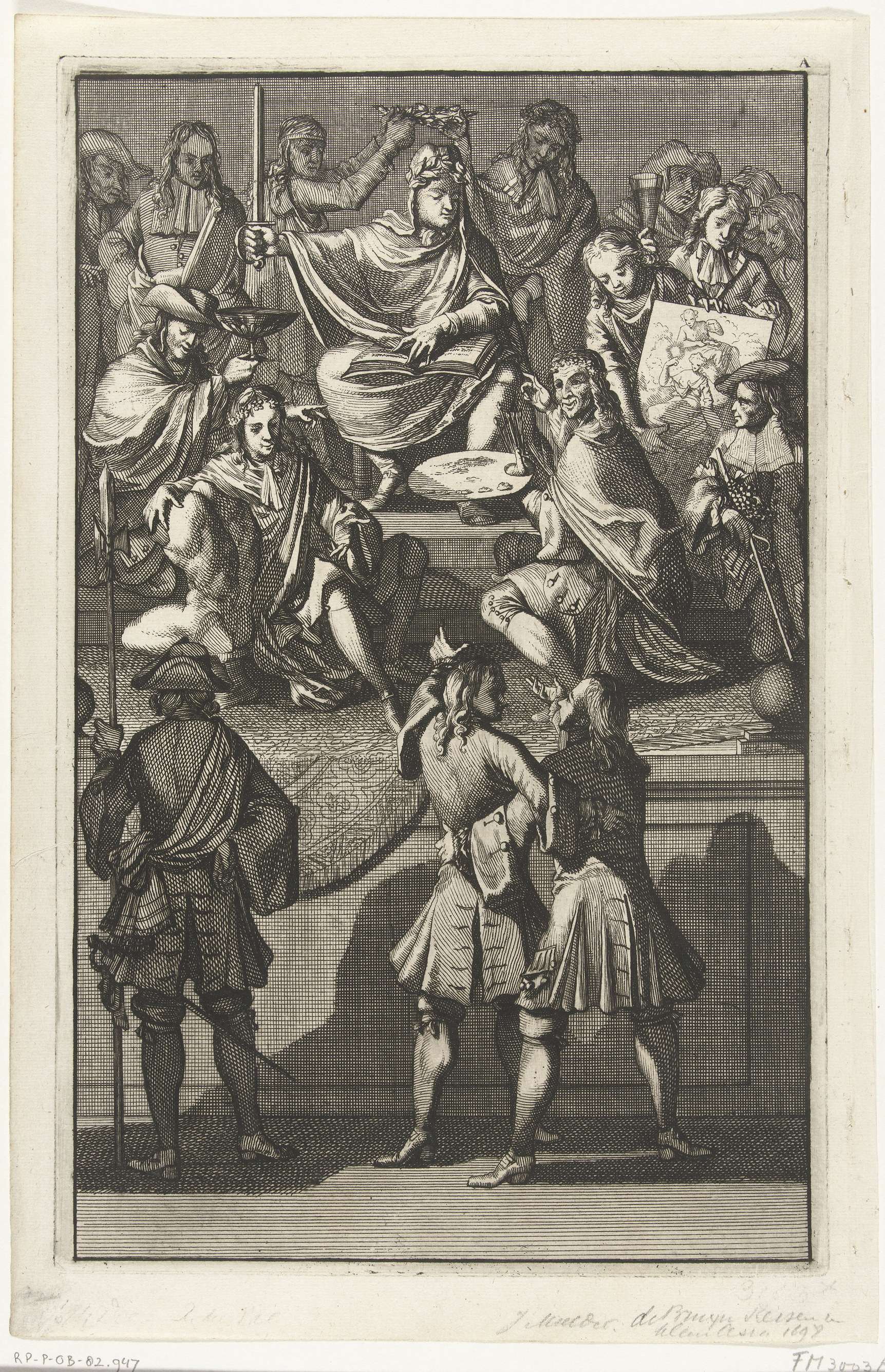 Ontvangst van Cornelis de Bruyn als nieuw lid van de Bentvueghels, 22 december 1674. Het gezelschap met het hoofd als een priester met zwaard in de hand en gekroond met een lauwerkrans, omringd door leden van de bentvogels, de groep van Nederlandse kunstenaars in Rome. Op de voorgrond het nieuwe lid (Cornelis de Bruyn) met ...