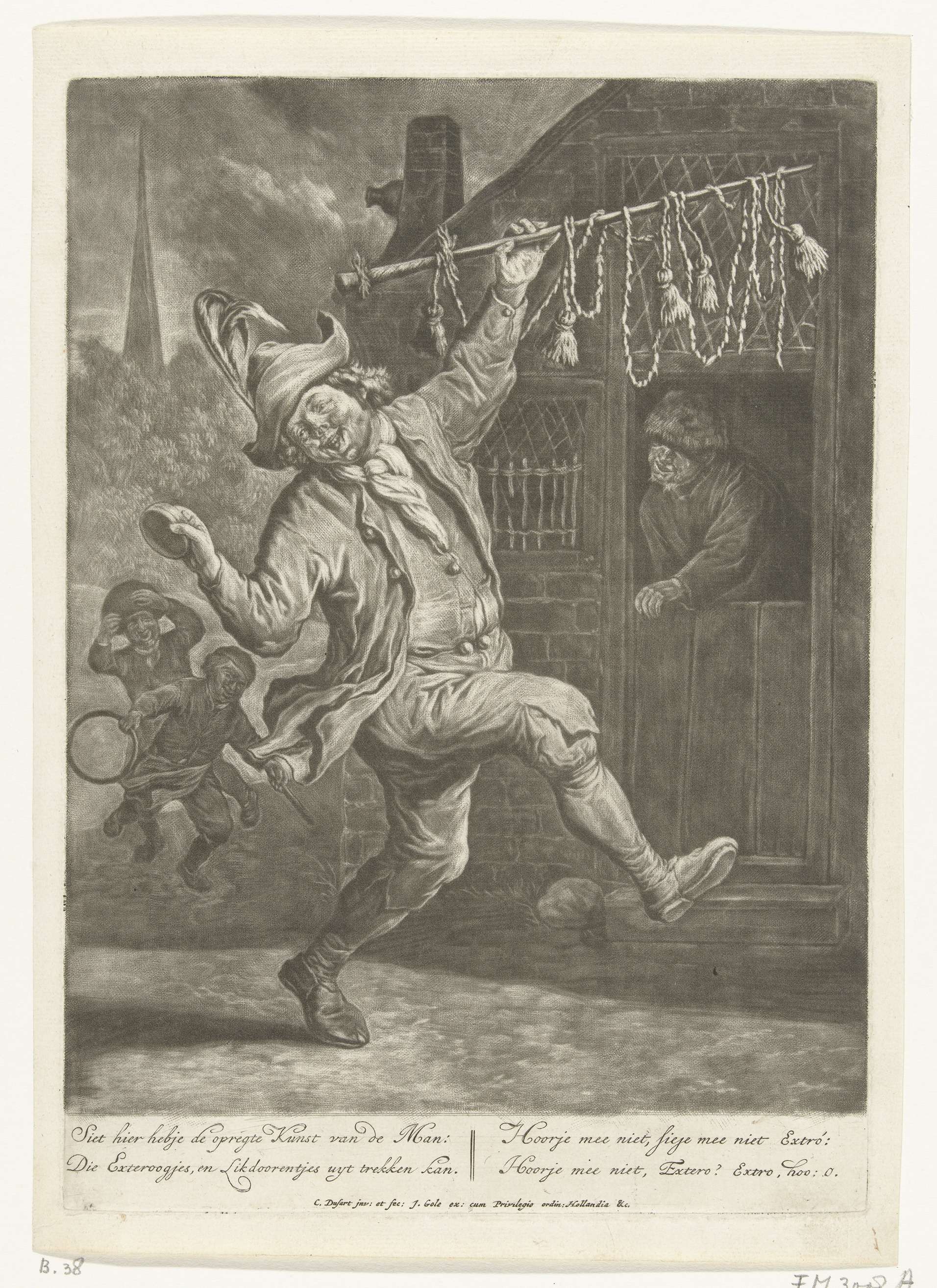 De likdoornsnijder. Een dansende en zingende man met een tamboerstok behangen met kwasten, in een huisje kijkt over een onderdeur een man lachend toe. In het onderschrift het vierregelig liedje dat de man zingt.