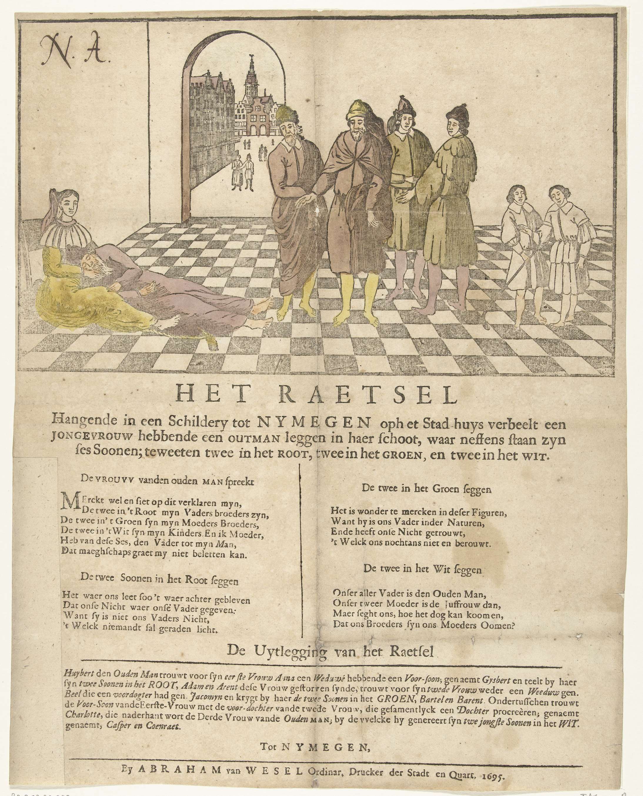 Het Nijmeegse Raadsel of het Gecompliceerde Huwelijk, 1619. Schilderij hangende op het raadhuis van Nijmegen met een familieportret met ingewikkelde relaties afkomstig uit een huwelijk aldaar gesloten in 1619. Met vier verzen en het uitleg van de raadsel op het blad onder de voorstelling.