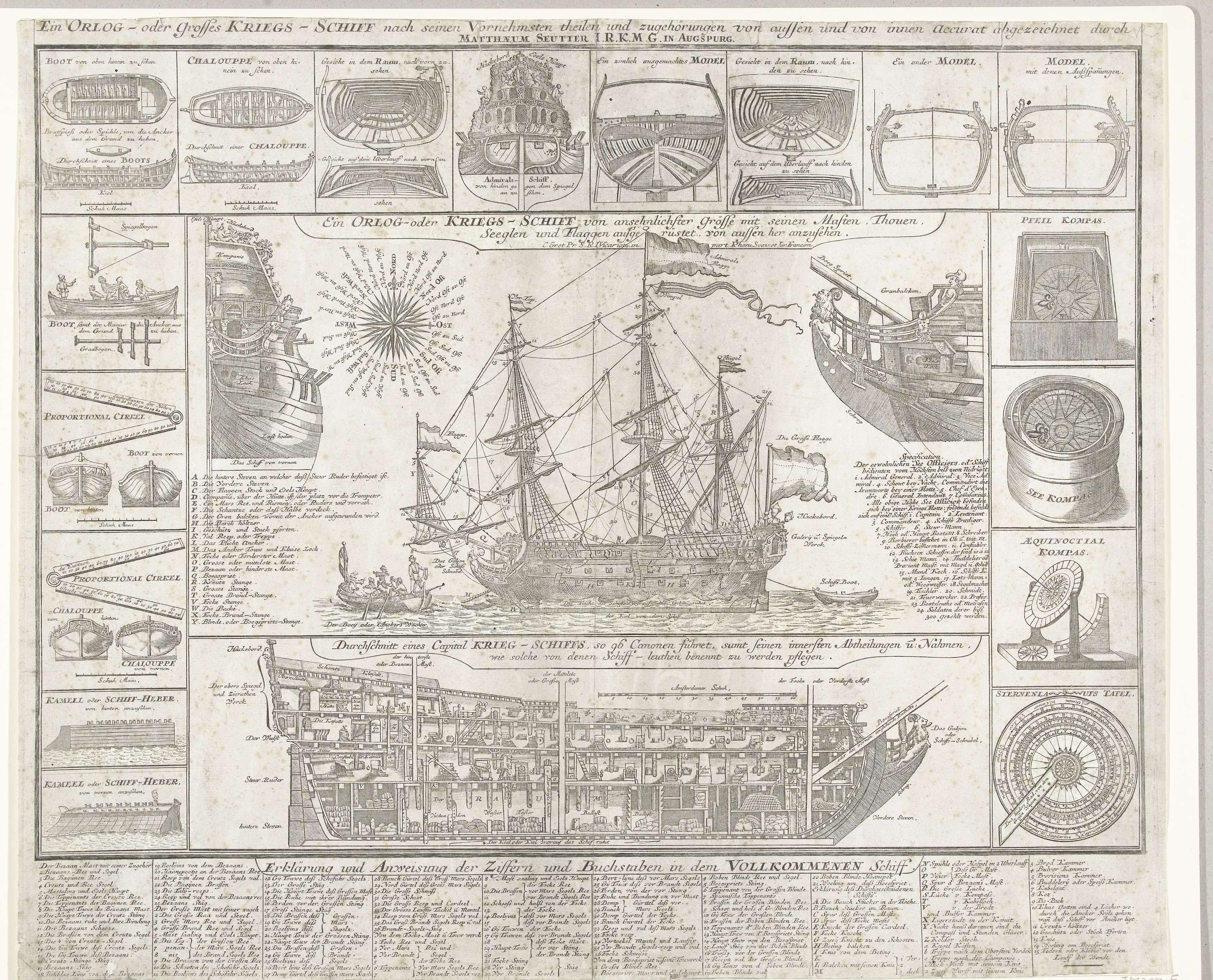 Zijaanzicht en doorsnede van een groot oorlogsschip. Met afbeeldingen van verschillende details en instrumenten. Met uitgebreide nummering van alle onderdelen en met de verklaring in het Duits.