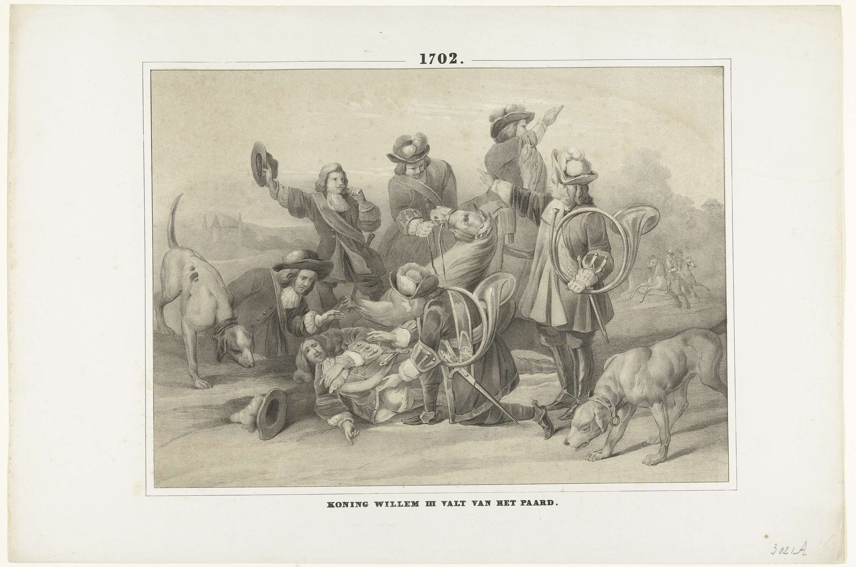 De dodelijke val van koning Willem III tijdens een jachtpartij, 4 maart 1702. De gevallen koning ligt op de grond, omringd door leden van de jachtpartij.