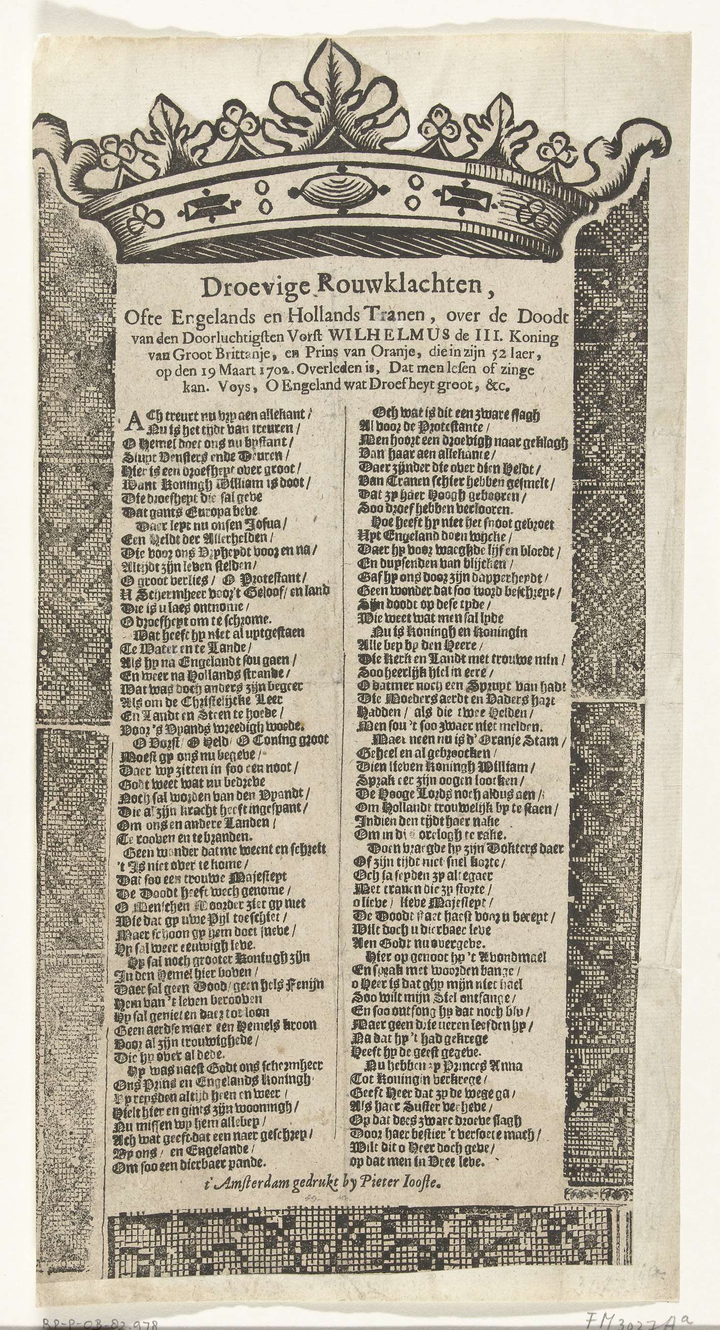 Rouwvers of rouwlied bij de dood van koning Willem III, 19 maart 1702. Vers in twee kolommen, in een kader, bovenaan een kroon.