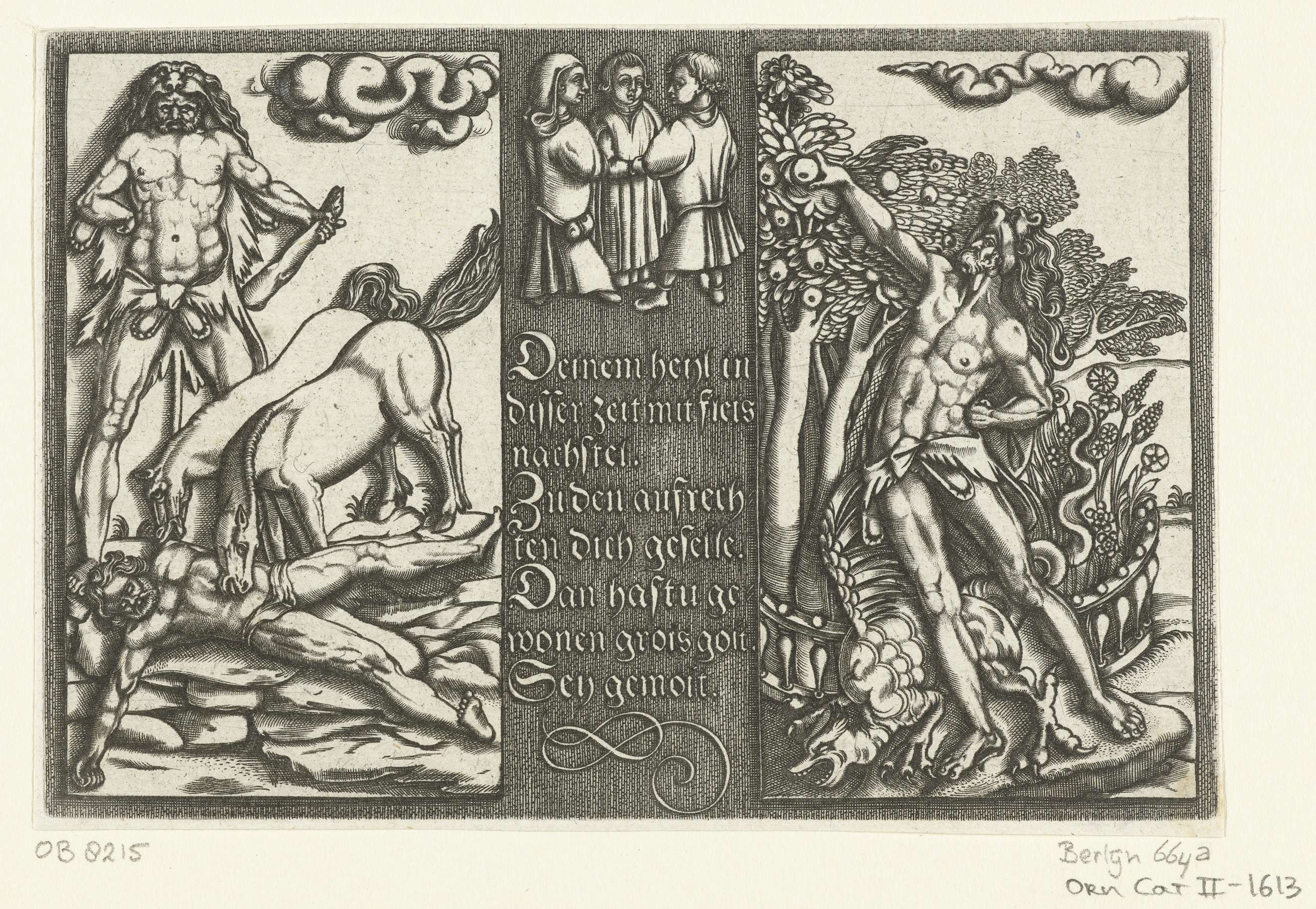 Links Herakles en de paarden van Koning Diomedes, rechts Hercules met de appels van de Hesperiden. Blad uit serie bestaande uit titelblad en acht ongenummerde bladen.
