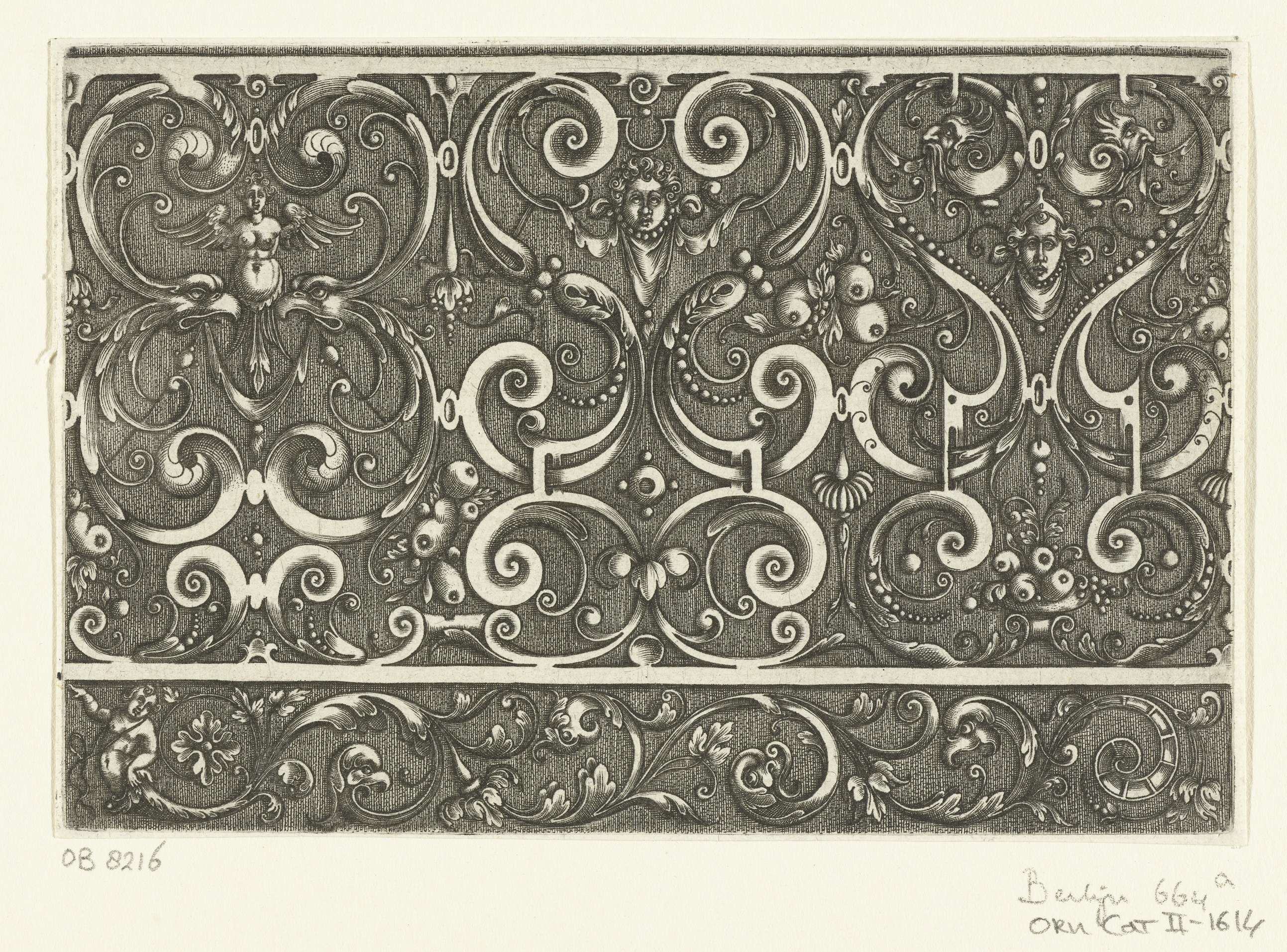 In het bovenste fries staan drie consoles met daarin een gevleugelde vrouwelijke herme, maskers en trossen fruit, in het onderste ligt een bladrank met monsterhoofden. Blad uit serie bestaande uit titelblad en acht ongenummerde bladen met friezen of lijsten waarin ornamenten voor goud- en zilversmeden staan afgebeeld.