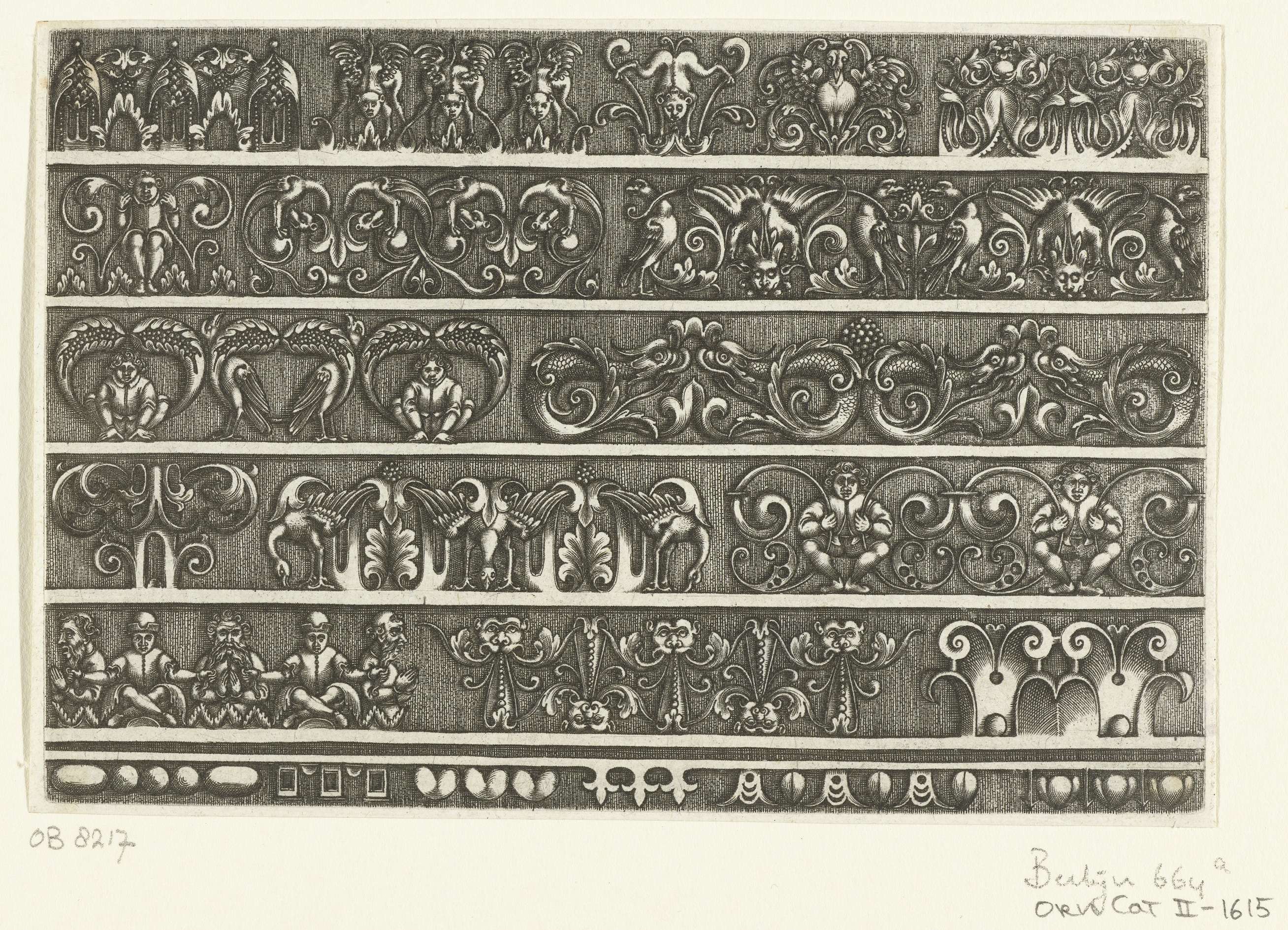 Randen met verschillende ornamenten, gestileerde bladranken met dieren of figuren en architectuurornamenten, zoals een eierlijst.