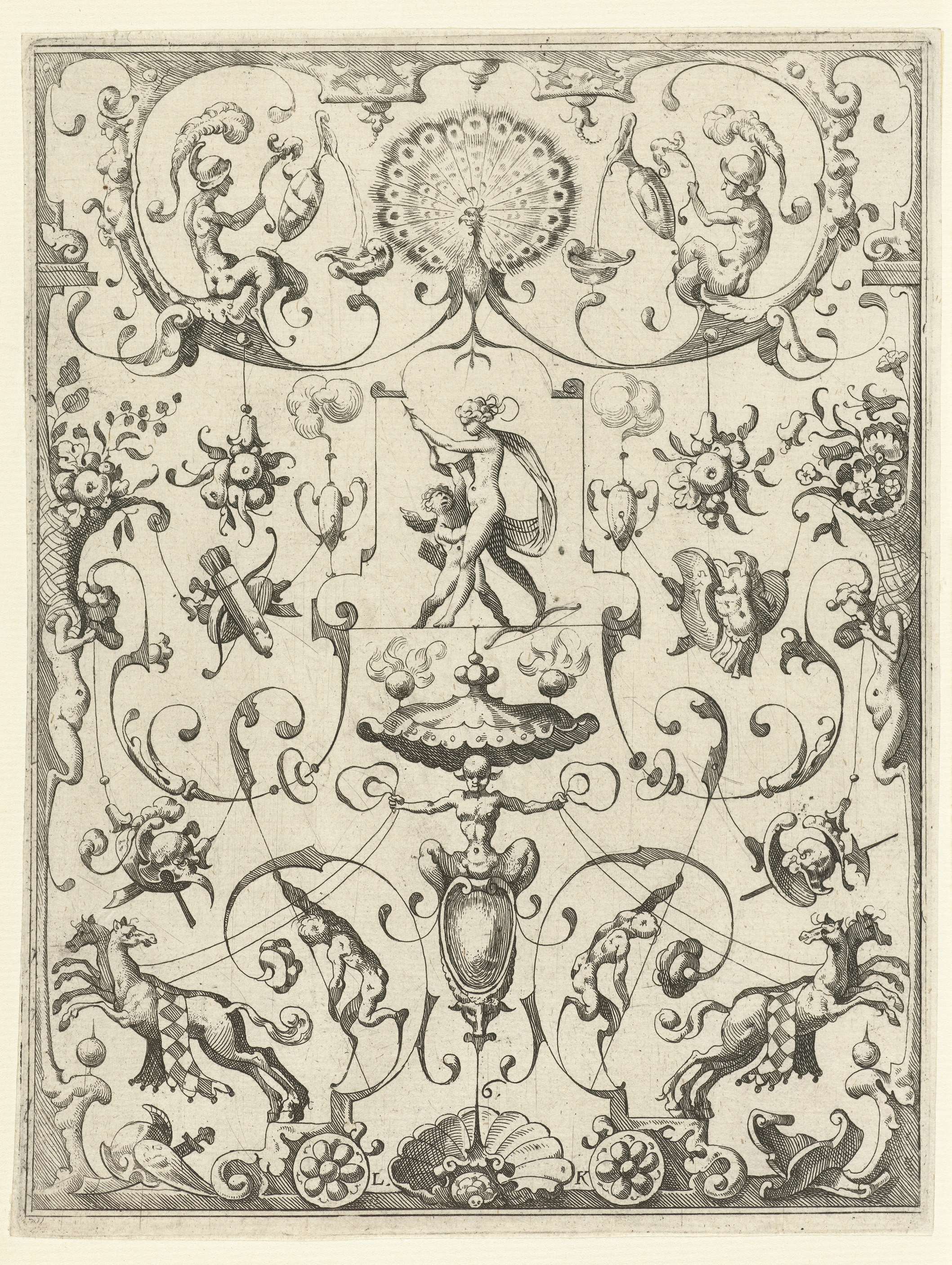 In het midden pakt Venus een pijl van Cupido af, terwijl zijn boog naar beneden valt. Blad 6 uit serie met groteske vlakdecoraties met kwabornamenten.