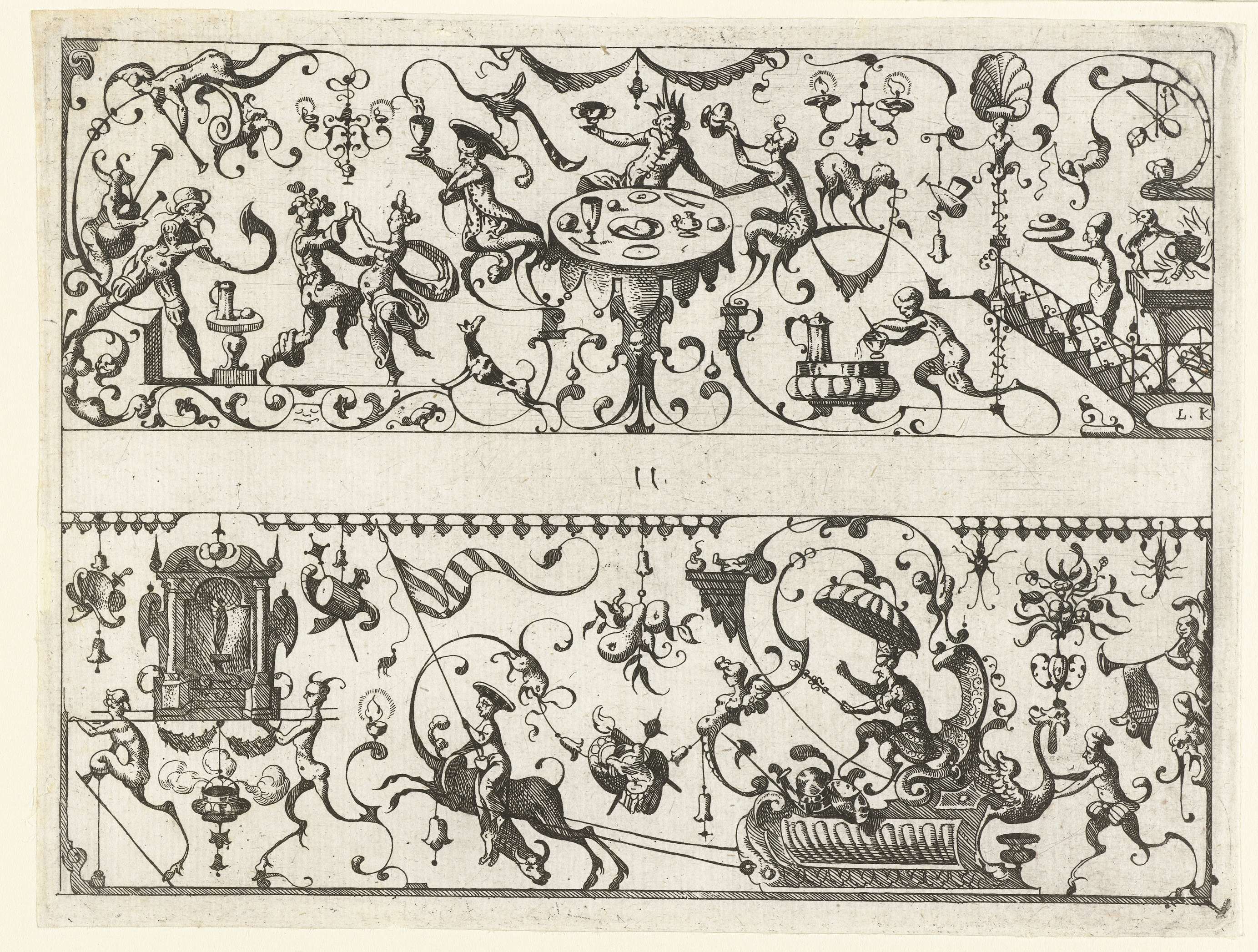 Op het blad staan twee friezen, in het bovenste is een herberg afgebeeld, in het onderste een processie. Blad 11 uit serie met groteske vlakdecoraties met kwabornamenten.