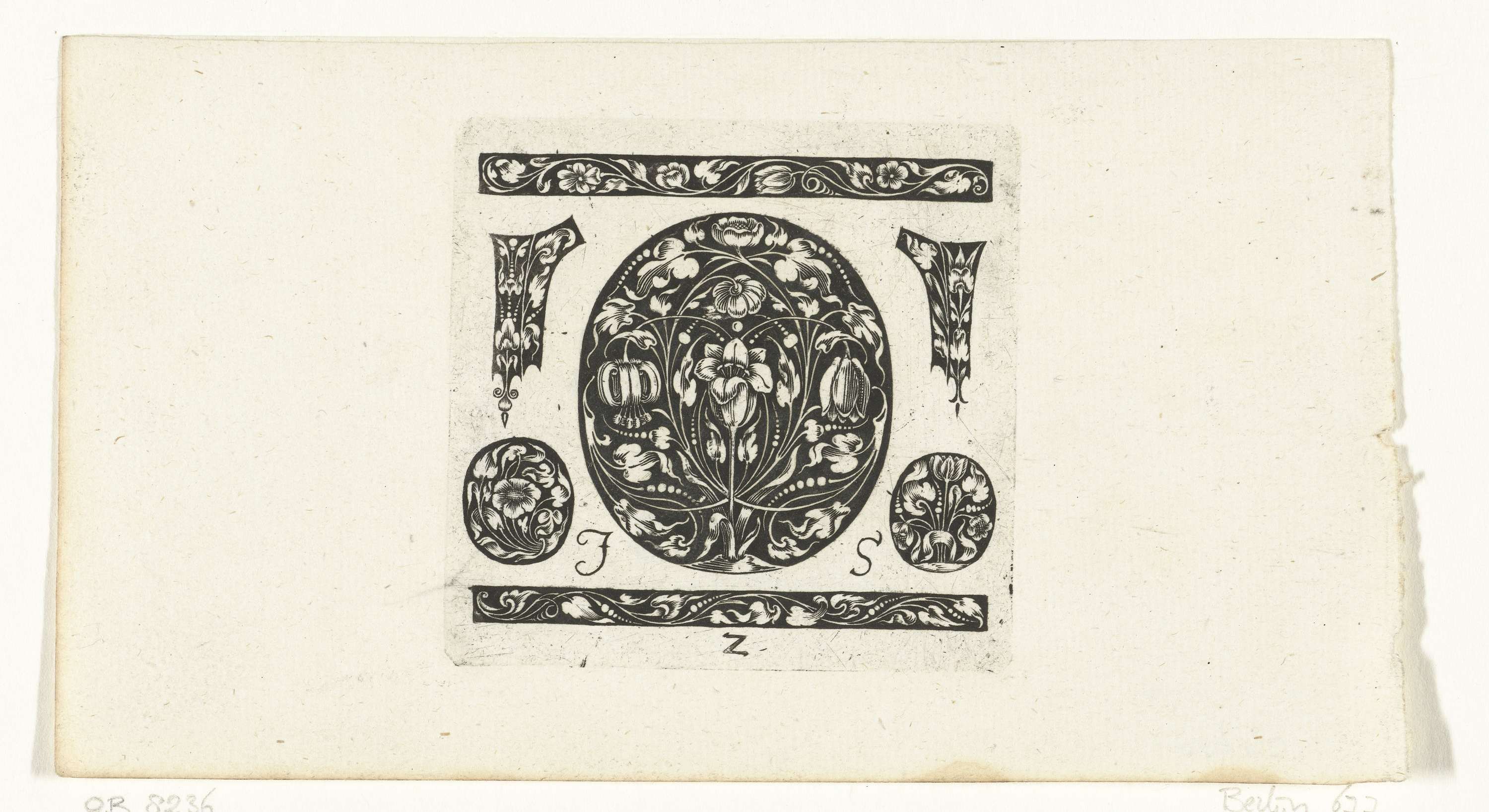 Gestileerde witte bloemen en bladranken op een zwarte ondergrond, met in het midden een ovaal tussen twee kleine friezen in.
