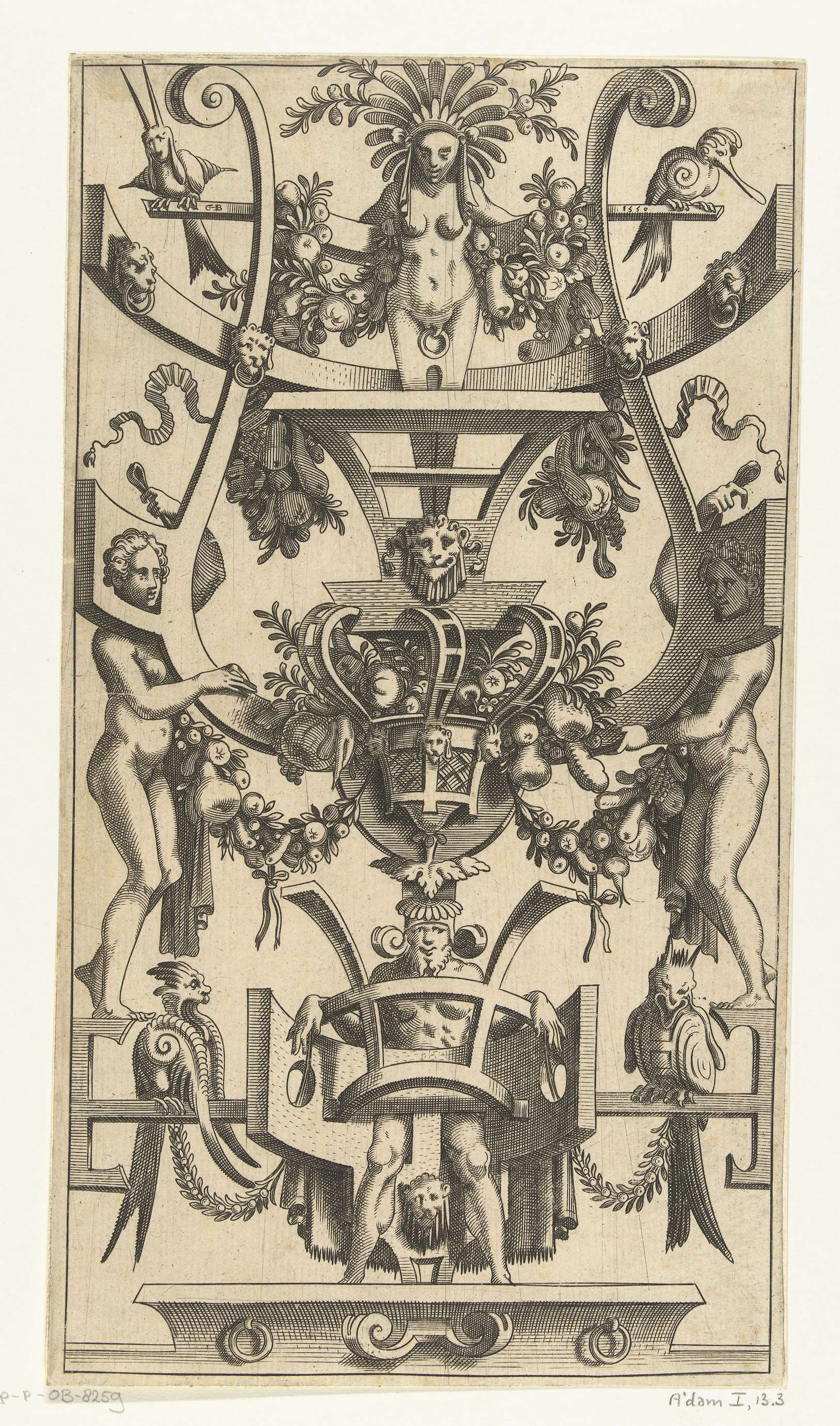 Boven de vruchtenkorf verheft zich een vrouwelijke herme, eronder staat een man, wiens benen door het rolwerk heen steken. Blad uit serie van 6 bladen met groteske vlakdecoraties met rolwerk, kandelabers, saters, vruchtenguirlandes, vogels en fantasiewezens.