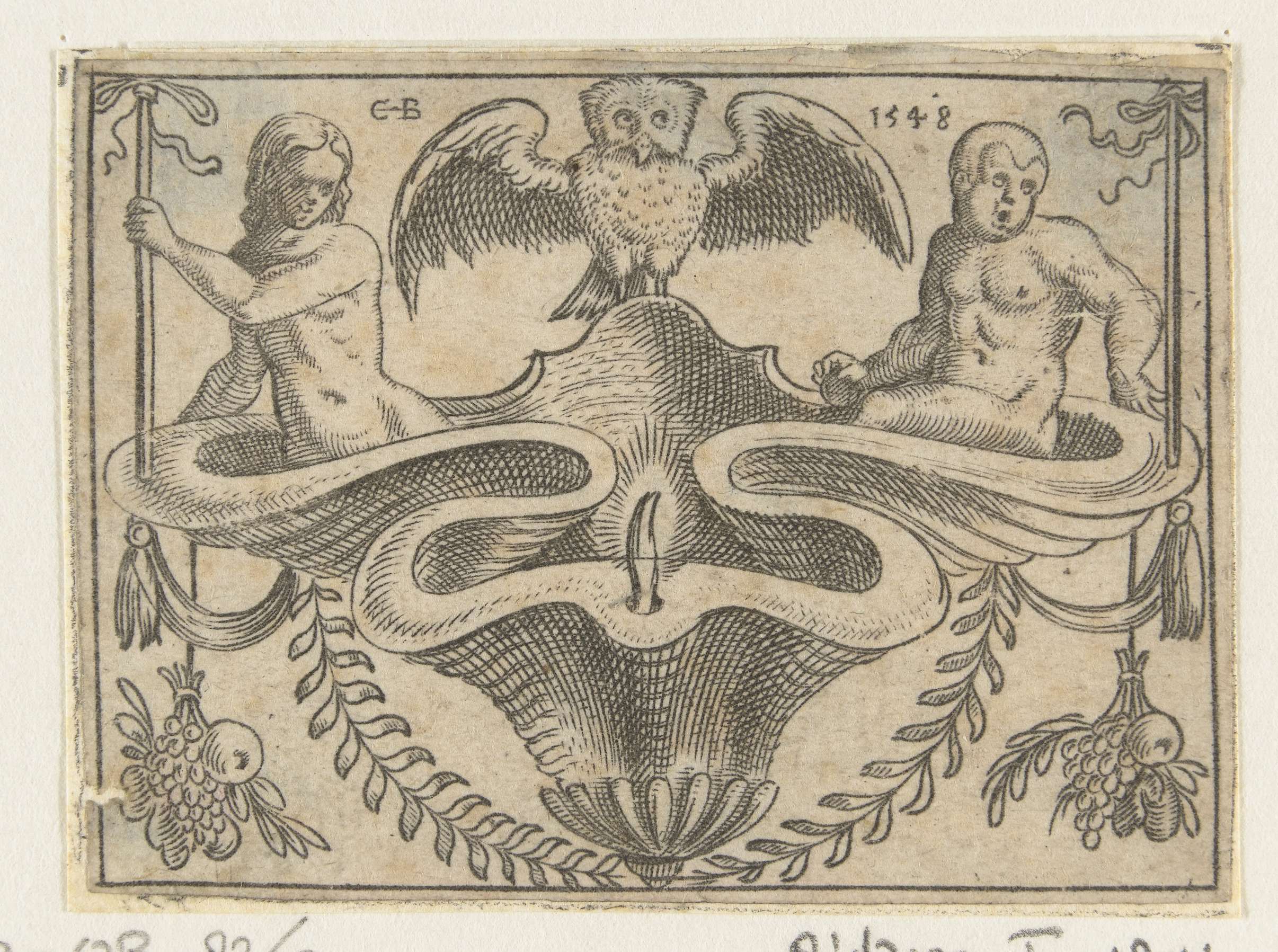 In het bekken zitten een man en een vrouw. Midden achter zit een uil, midden voor brandt een vlammetje. Een van 4 bladen uit een serie van 8.