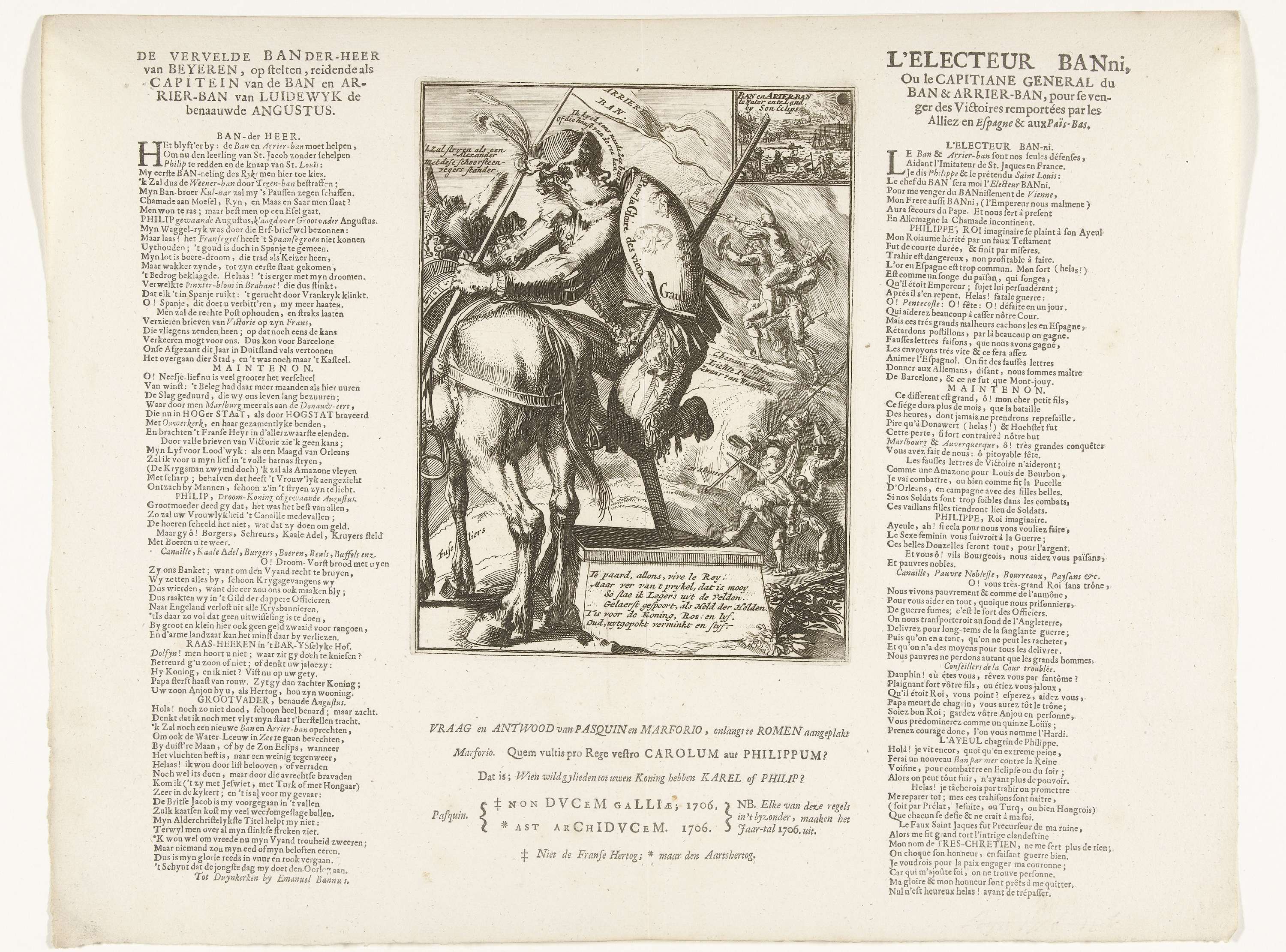 Spotprent op Maximiliaan II Emanuel, keurvorst van Beieren als een onbekwame ruiter met een houten been die op een paard klimt. Op het blad naast en onder de plaat teksten in het Nederlands en Frans. Volgens het onderschrift uitgegeven te Duinkerke bij Emanuel Bannus. Onderdeel van een reeks van 19 spotprenten op de Fransen en ...