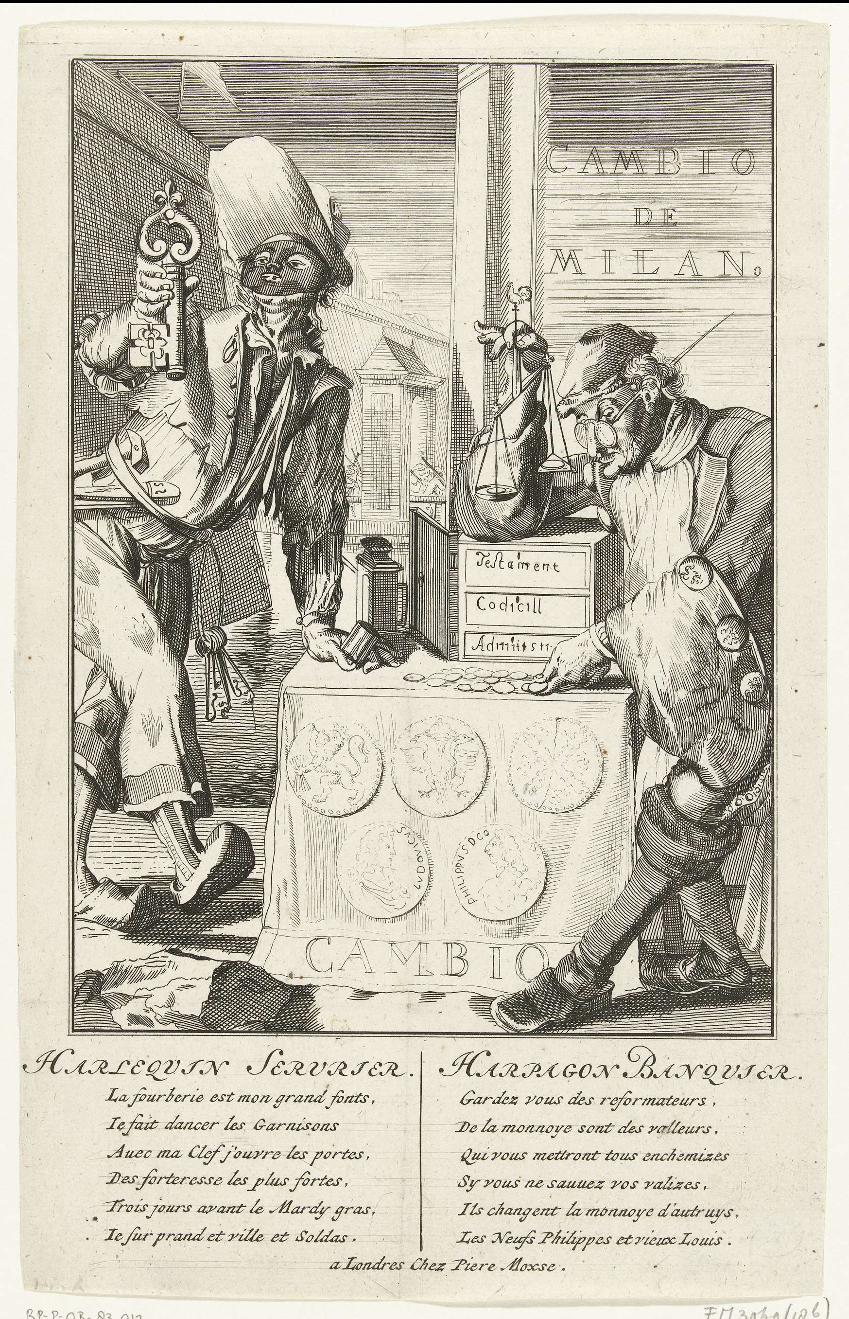 Wisselkantoor van Milaan waarin koning Lodewijk XIV (Harpagon) geld afweegt voor Harlekijn die voor hem staat, gemaskerd en met een sleutel in de hand. Met twee verzen in het Frans in het onderschrift. Onderdeel van een reeks van 19 spotprenten op de Fransen en bondgenoten uit het jaar 1706.