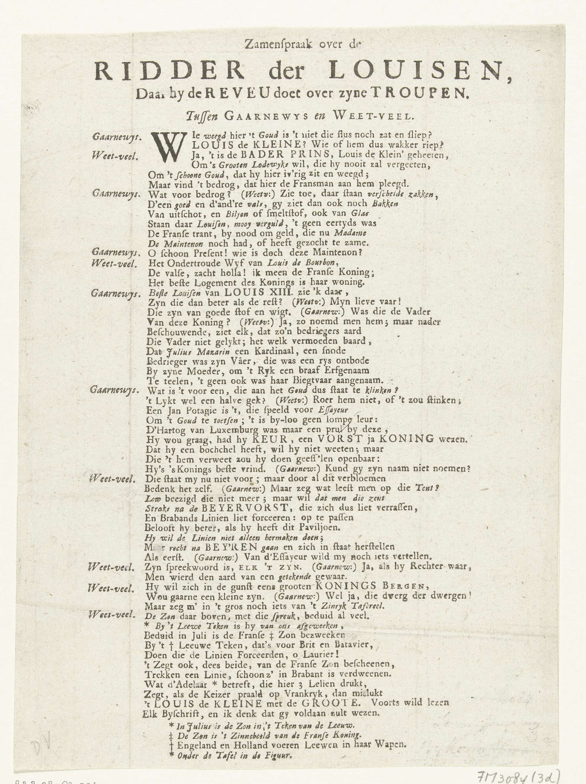 Samenspraak tussen Gaarnewys en Weet-Veel over de Ridder der Louisen, de voorstelling van Harlekijn (koning Lodewijk XIV) met triangel en bochel, die Lodewijk Willem, markgraaf van Baden-Baden, die geld aan het wegen is, komt overreden over te lopen naar Franse zijde. Vers in het Nederlands. Onderdeel van een reeks van 7 spotprenten op de Fransen ...