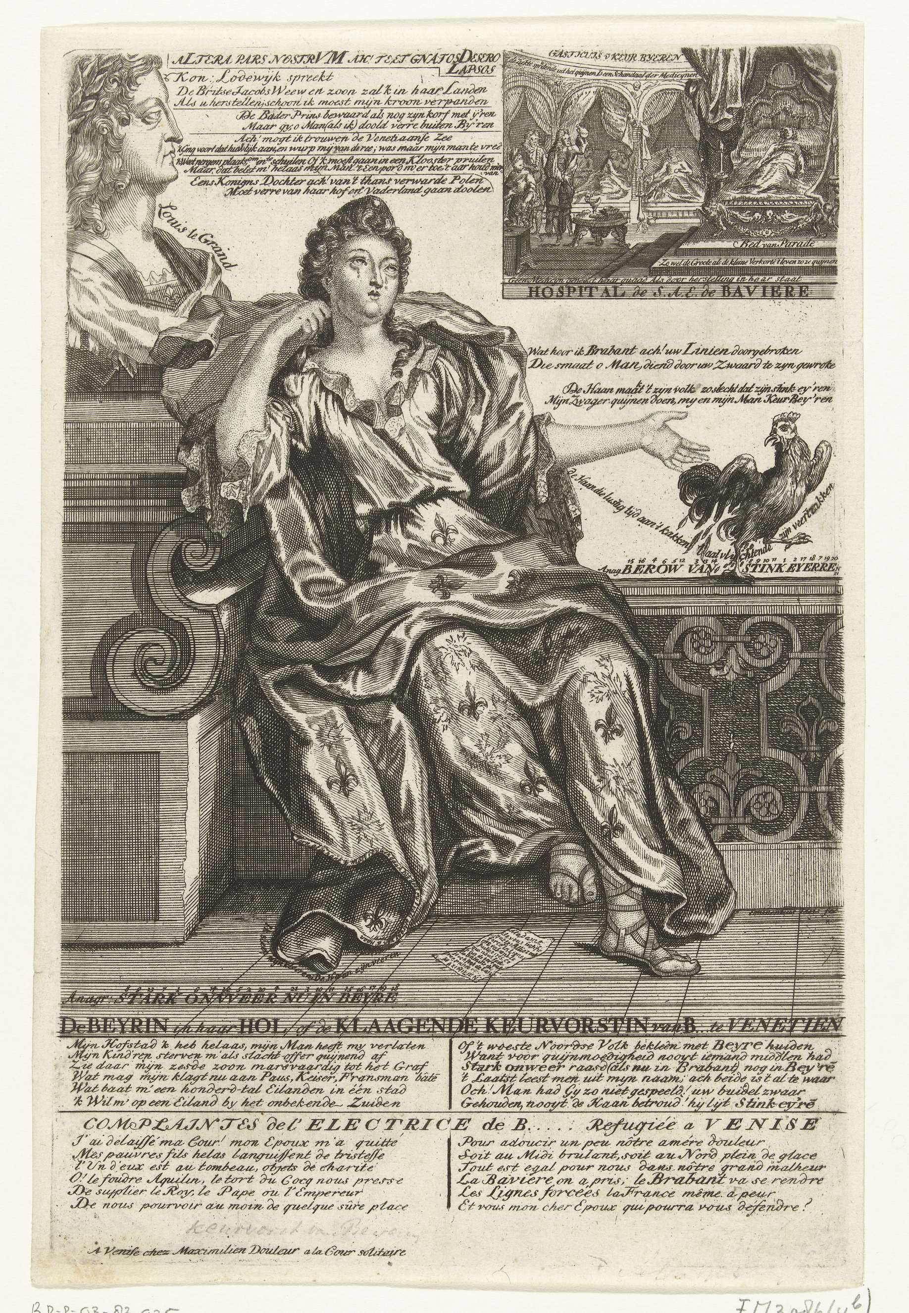 Klacht van Theresia Kunigunde Sobieska, keurvorstin van Beieren (de echtgenote van Maximiliaan II Emanuel, keurvorst van Beieren), 1705. Links een grote buste van koning Lodewijk XIV. In de plaat verzen in het Nederlands en Frans. Onderdeel van een reeks van 7 spotprenten op de Fransen en bondgenoten uit het jaar 1705.