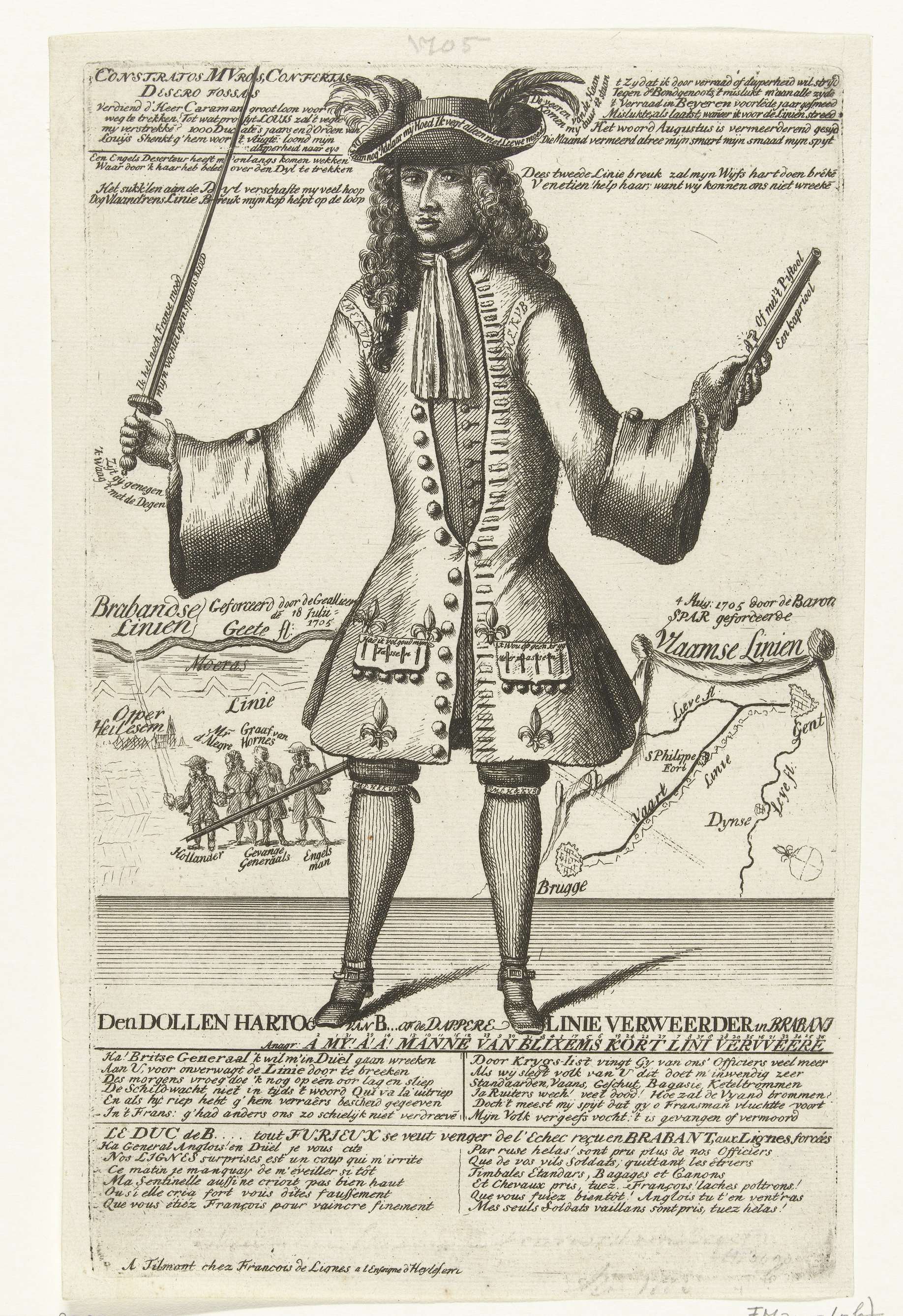 Spotprent op Maximiliaan II Emanuel, keurvorst van Beieren, 1705. De keurvorst staande ten voeten uit, op de achtergrond kaarten met de Brabantse Linies en de Vlaamse Linies (op 4 augustus geforceerd door Baron Sparre). Op zijn mantel staan Franse lelies. In de plaat opschriften in het Nederlands en Frans. Onderdeel van een reeks van 7 ...