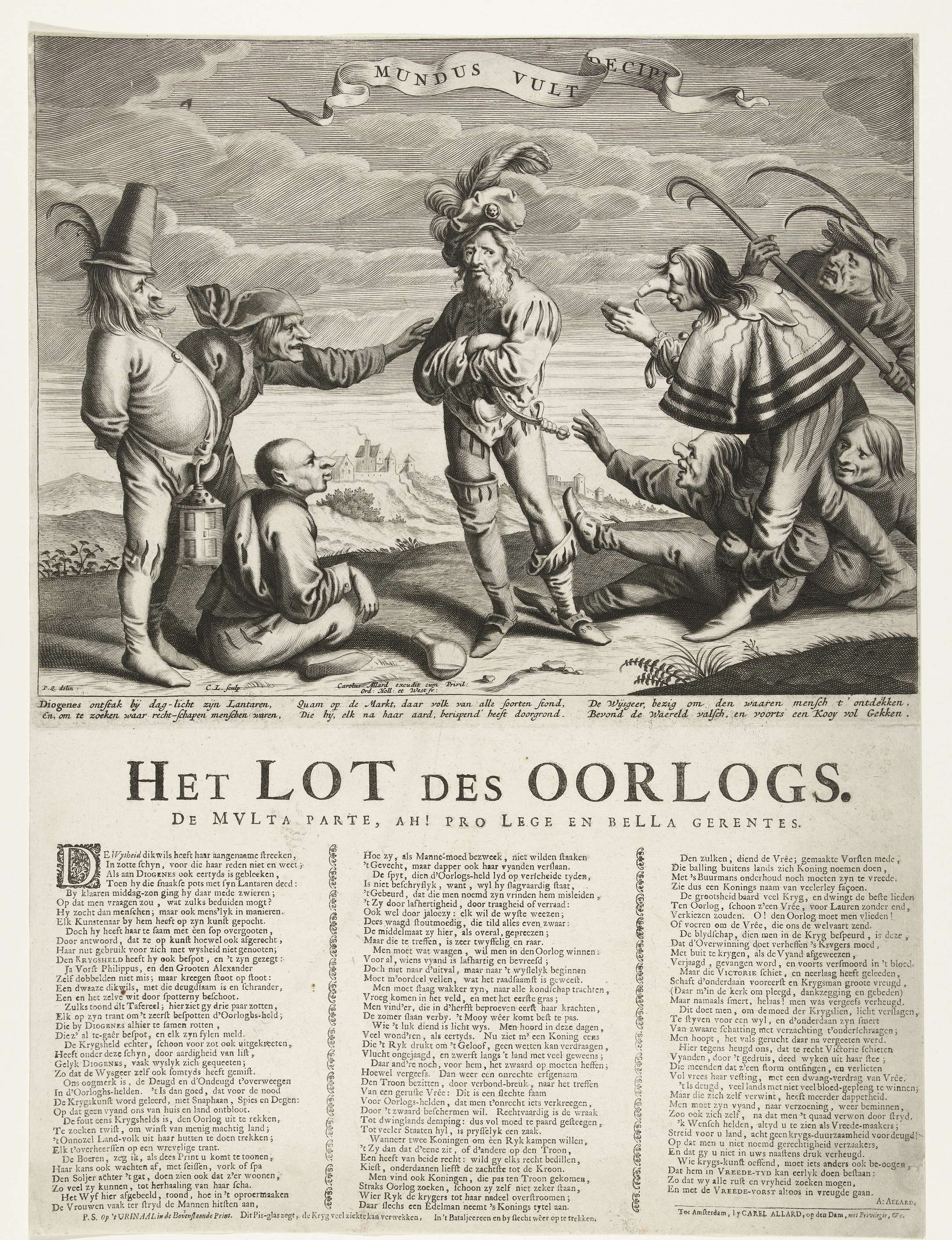 De wijsgeer Diogenes wordt op de markt waar hij met een lantaarn naar een mens zocht door het volk bespot. De voorstelling hier gebruikt als spotprent in de context van de Spaanse Successieoorlog. Op het blad onder de plaat een vers in 3 kolommen in het Nederlands. Onderdeel van een reeks van 25 spotprenten op ...